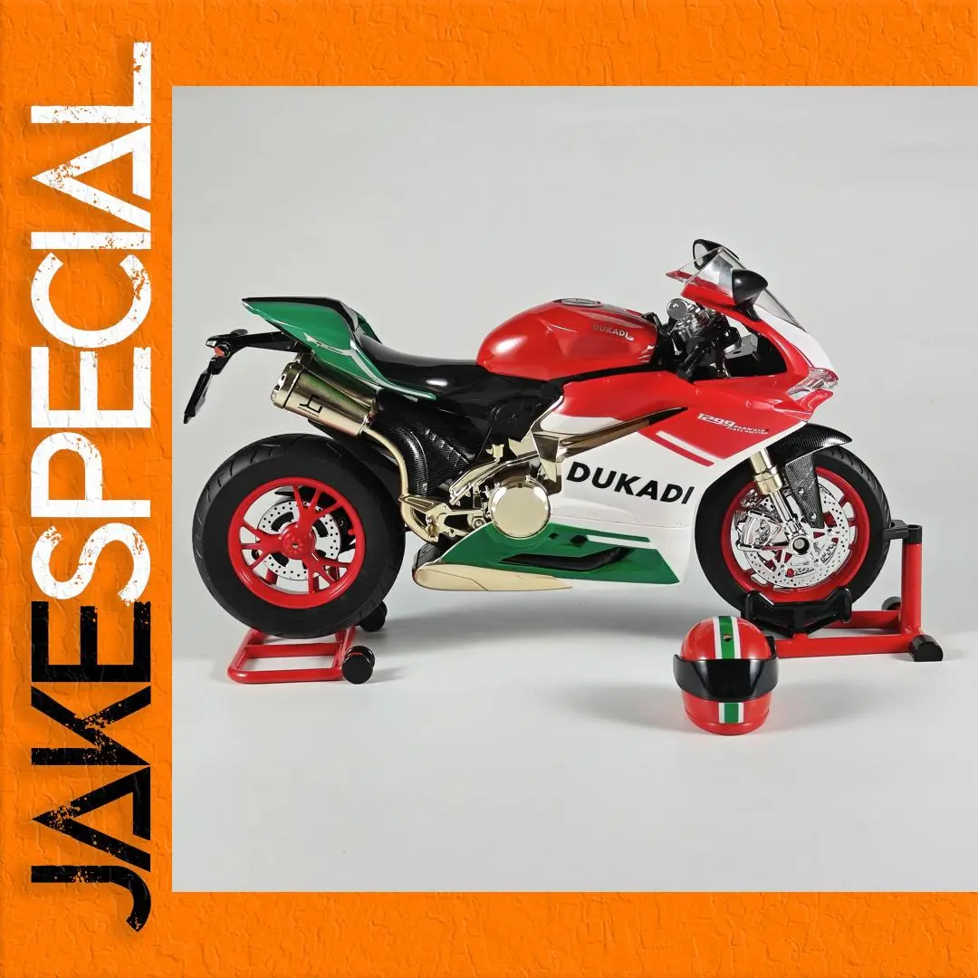 Experience the thrill of racing with this meticulously crafted Ducati 1199 Panigale R diecast model. Sized at 1:8 scale, this collectible replica captures every line and curve of the iconic motorcycle, from its aerodynamic fairing to the detailed wheels with red rims and black tread tires. The model boasts a vibrant glossy red finish, complemented by white, gold, black, and green accents that evoke its true racing livery. Its realistic metallic components include a shiny gold exhaust, silver drilled brake rotors, and detailed suspension and chain drive, adding authentic visual appeal. Enhanced with sound and light effects, it becomes an eye-catching display piece that embodies speed and craftsmanship in perfect harmony, ideal for enthusiasts and collectors alike.