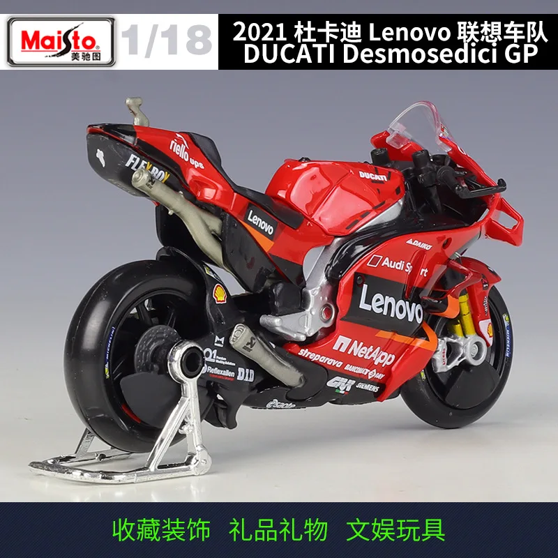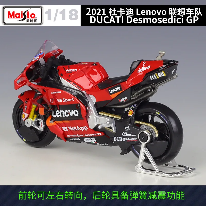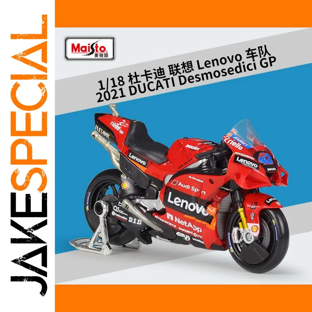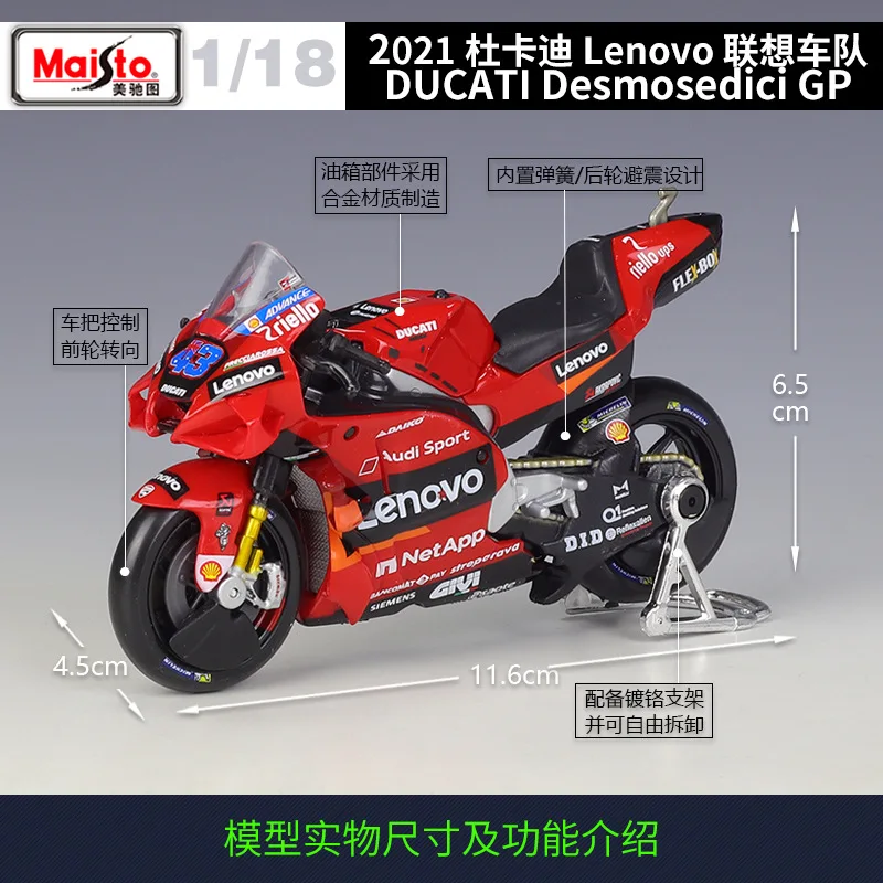 Experience the thrill of MotoGP with this highly detailed 1:18 scale diecast model of the Ducati Desmosedici, representing the 2021 and 2022 seasons, specifically models numbered #63 and #44. Crafted from metal, this collectible boasts vibrant red bodywork with sleek aerodynamic fairings, a clear windscreen revealing detailed handlebar controls, and gold-finished front forks contrasting with black wheels featuring visible disc brakes. The side fairings display crisp sponsor logos, complemented by intricately modeled engine components, a polished silver exhaust pipe, and metallic suspension parts. Perfect for enthusiasts aged 18+, it offers an authentic, racing-inspired aesthetic that captures the essence of Ducati’s iconic MotoGP bikes.