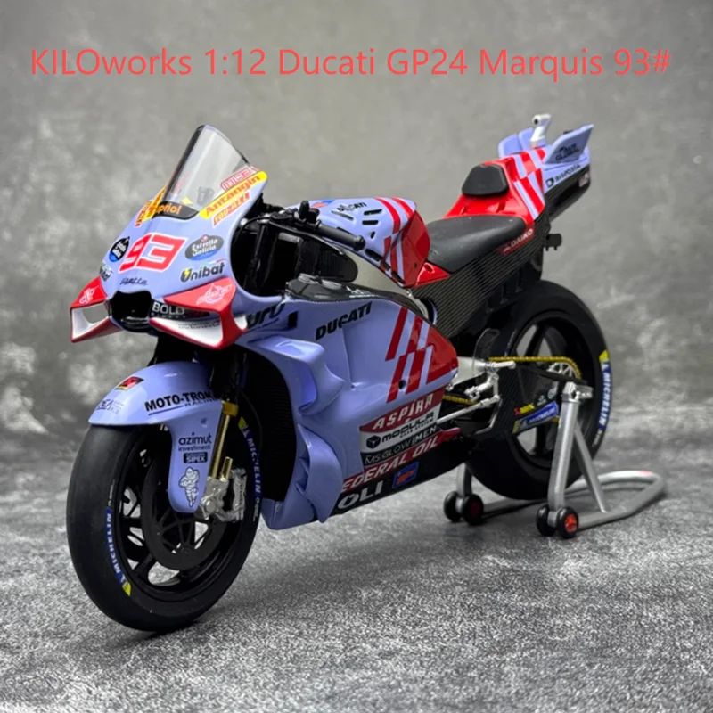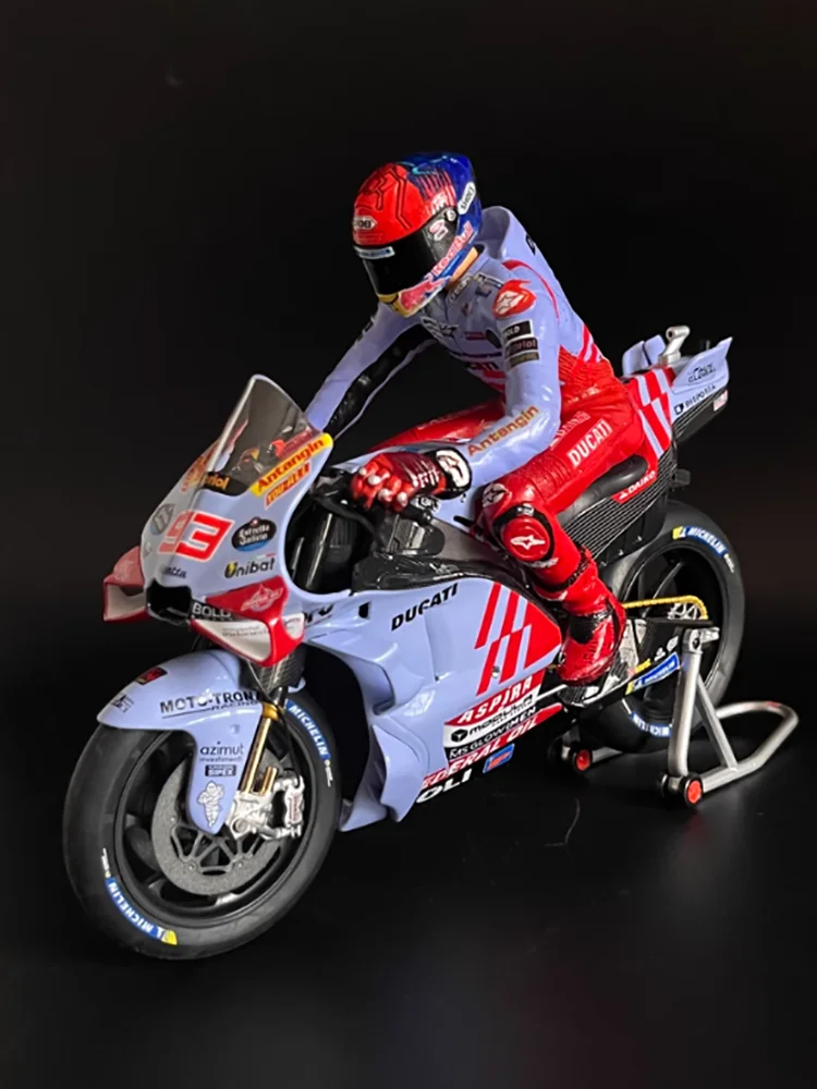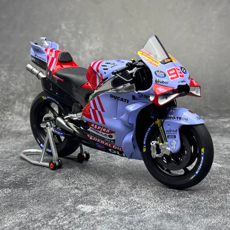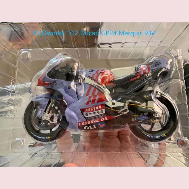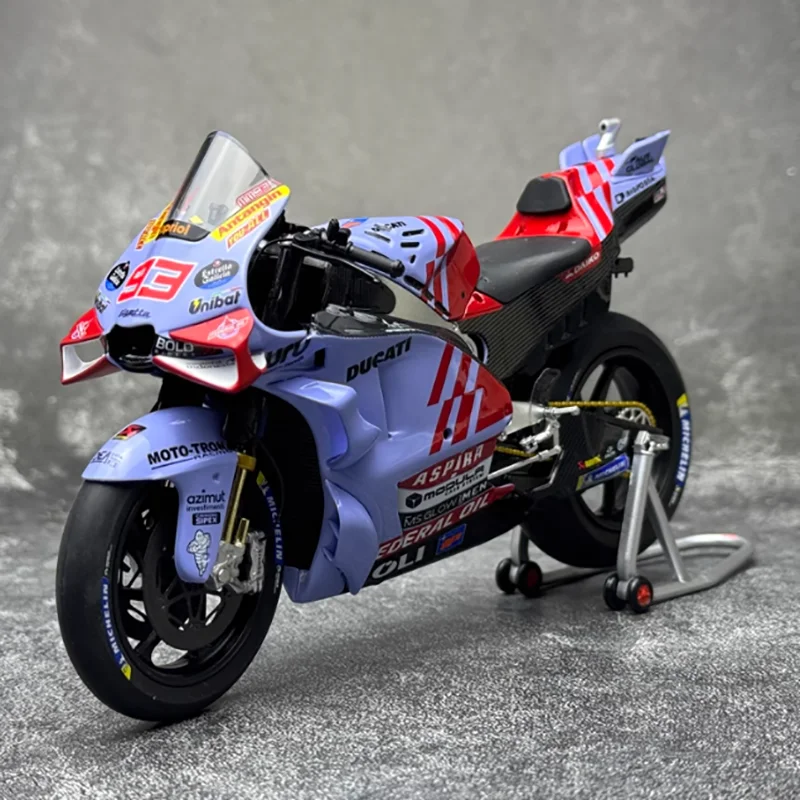 Experience the thrill of MotoGP with this highly detailed 1/12 scale diecast alloy motorcycle model of the Ducati GP24, numbered 93#. Crafted from durable metal, this non-electric collectible replica showcases intricate design features including an aerodynamic racing fairing, racing slick tires, and realistic sponsor decals in white, red, and black. Perfect for display, it captures the essence of a professional race bike with precision and authenticity. The packaging’s vibrant light blue and red palette, combined with a transparent motorcycle-shaped window, highlights its sporty appeal. This model is ideal for enthusiasts seeking an authentic, meticulously crafted addition to their collection.