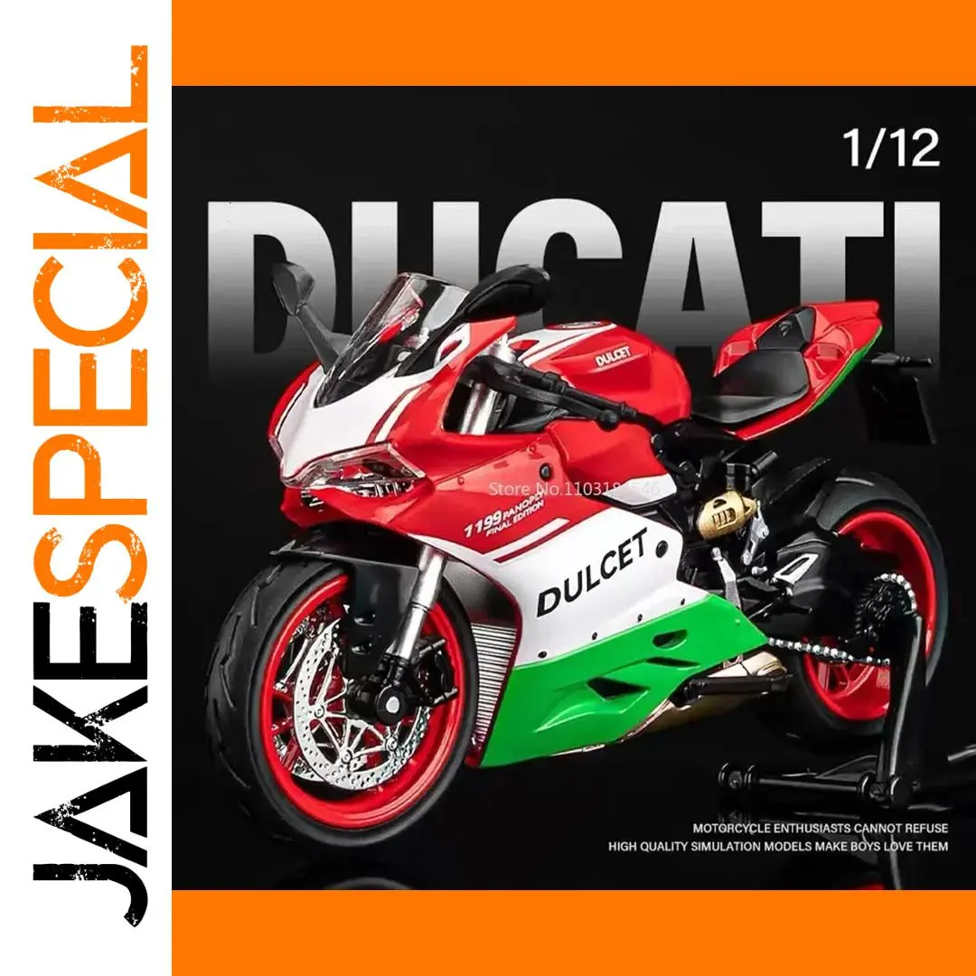 Experience the thrill of owning a meticulously crafted diecast model of the iconic Ducati Panigale V4 motorcycle. Designed for adult collectors and enthusiasts, this 1:32 scale replica captures the essence of high-performance motorbikes with incredible realism. The vibrant red body, accented with white and green details, encapsulates Ducati’s racing spirit. Every element, from the aerodynamic fairings to the textured black racing seat, is faithfully reproduced to showcase craftsmanship and attention to detail. The model features striking red rims on the realistic black tires, a metallic finish on the engine and exhaust, and silver front forks. Perfect as a display piece or gift for motorcycle aficionados, it invites you to imagine yourself in the rider's seat, relishing the high-energy design.