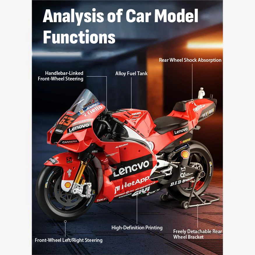 - Precisely sized for optimal display, based on 2018 KTM 450SXF and 2022 Ducati Racing No. 63 models, emphasizing authenticity.