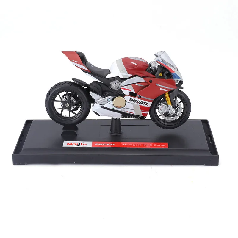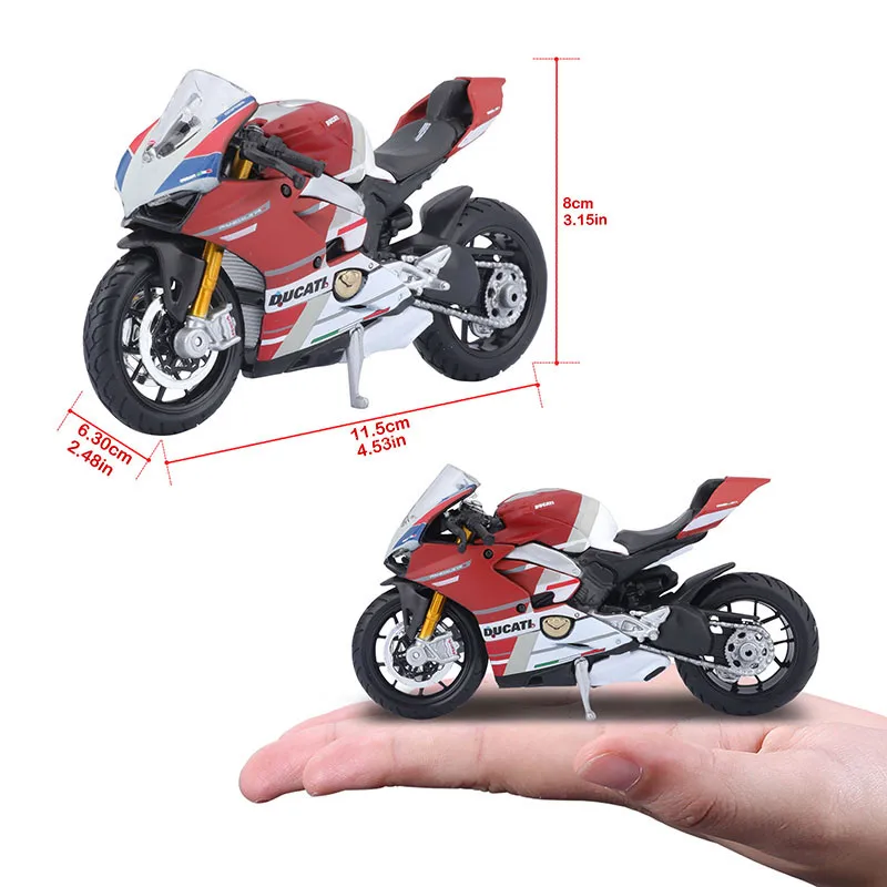 Experience the thrill of high-performance motorcycle craftsmanship with this detailed 1:18 scale die-cast model, measuring approximately 12cm x 4.5cm x 6.5cm. Crafted with a metal fuel tank and plastic body parts, it features dynamic movable front wheel and handlebar, a functional kickstand, spring-loaded rear suspension, and free-rolling wheels. Designed for adult collectors and enthusiasts, this collectible replica showcases authentic design elements inspired by modern sportbike aesthetics, including vivid red and black accents, gold highlights, and aerodynamic styling. Perfect for display, it offers a realistic depiction of a high-speed, sleek motorcycle, bringing the excitement of motorcycle engineering into your collection.