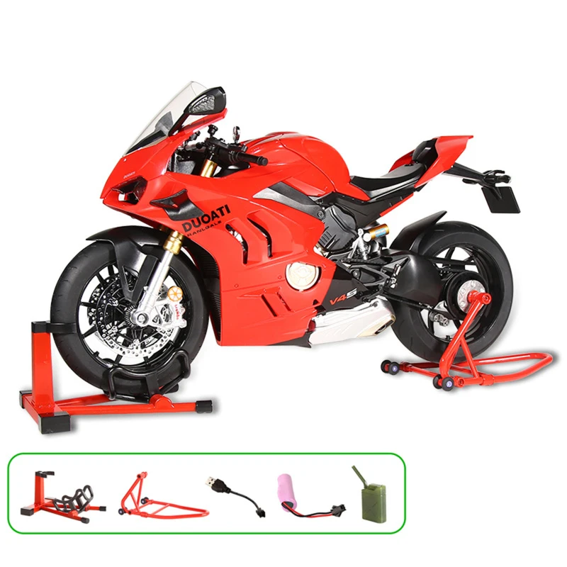 - Features a realistic aerodynamic design inspired by the Ducati V4 series, with angular fairings and detailed mechanical accents.