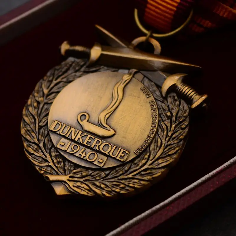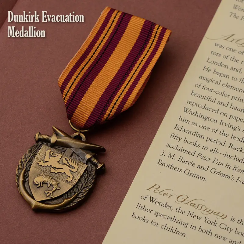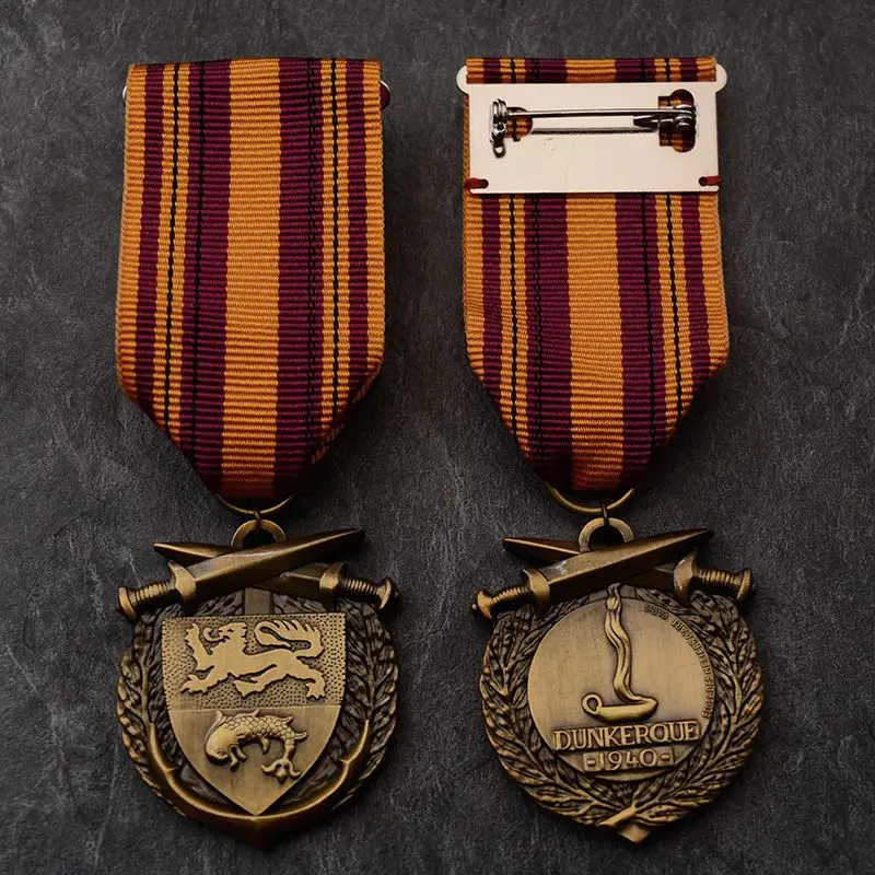 Experience a piece of history with this beautifully crafted commemorative medal, celebrating the Dunkirk evacuation. Designed with a nostalgic and vintage aesthetic, it features an antique bronze-like finish that evokes timeless European heritage. The detailed relief work showcases a heraldic shield at its center, divided into three sections: a fierce lion rampant and a lion passant symbolizing strength and valor. The surrounding border, resembling laurel or oak leaves, adds a regal touch of honor. Two crossed swords above the shield provide a martial, historic feel. Attached to a vertically striped ribbon in yellow, dark red, and black, this medal is both a collectible keepsake and a distinguished gift for history enthusiasts or collectors of military memorabilia.