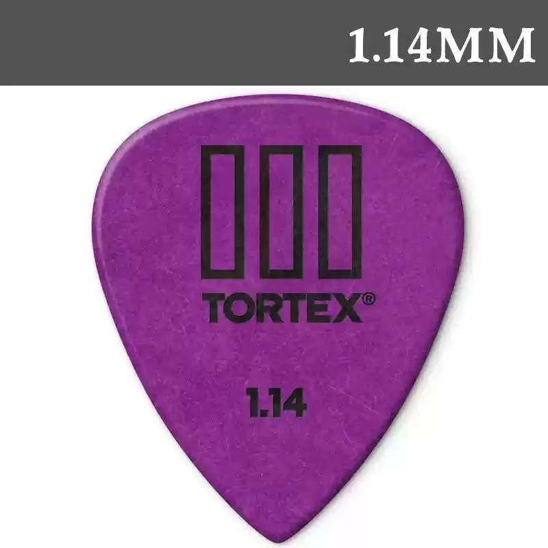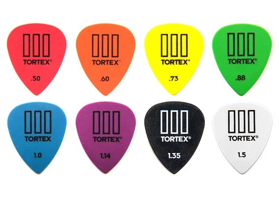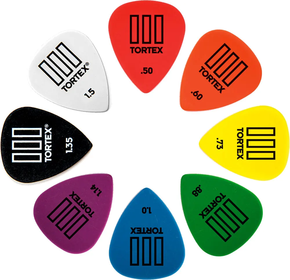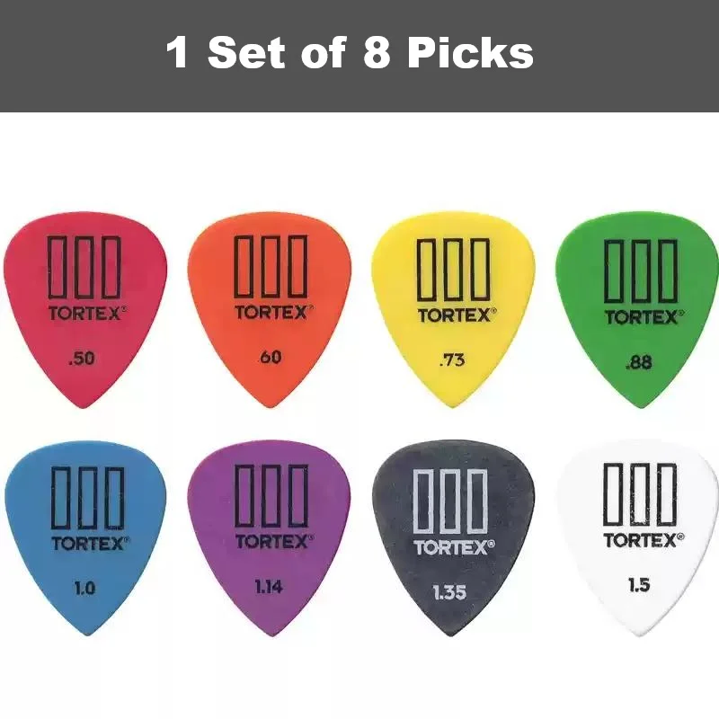 Enhance your playing with this set of eight USA-made Dunlop Tortex T III Guitar Picks, featuring a hybrid design with a Jazz III-style pointed tip for superior accuracy and a standard Tortex shape for comfort and grip. Crafted from durable Tortex material with a textured matte finish, these picks are color-coded by thickness: 0.50mm (Red, extra light), 0.60mm (Orange, light), 0.73mm (Yellow, medium), 0.88mm (Green, medium-heavy), 1.00mm (Blue, heavy), 1.14mm (Purple, extra heavy), 1.35mm (Black, ultra heavy), and 1.50mm (White, maximum stiffness). Ideal for versatile use, they deliver increased speed, control, and precision for intricate solos and fast picking.