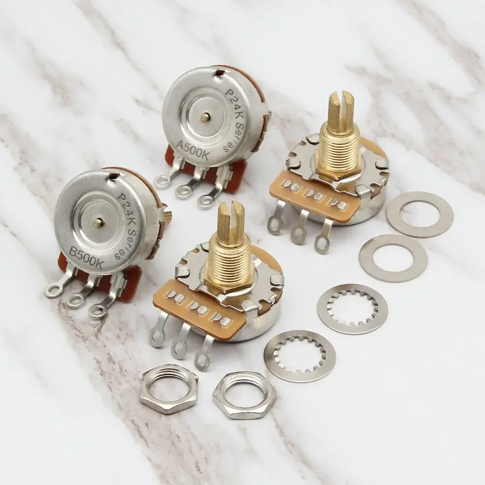- Resistance of 500k ohms for all units, with smooth operation, reduced shaft wobble, and high durability suitable for frequent use on electric guitars and basses.