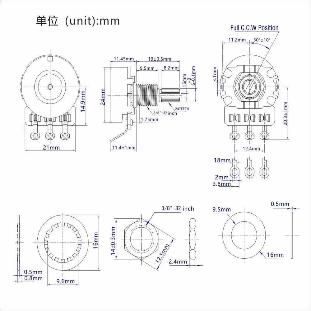 - Technical specifications extend to metal construction, knurled shaft, resistance values, shaft dimensions, threading details, and included mounting hardware, ensuring comprehensive features for professional use.
