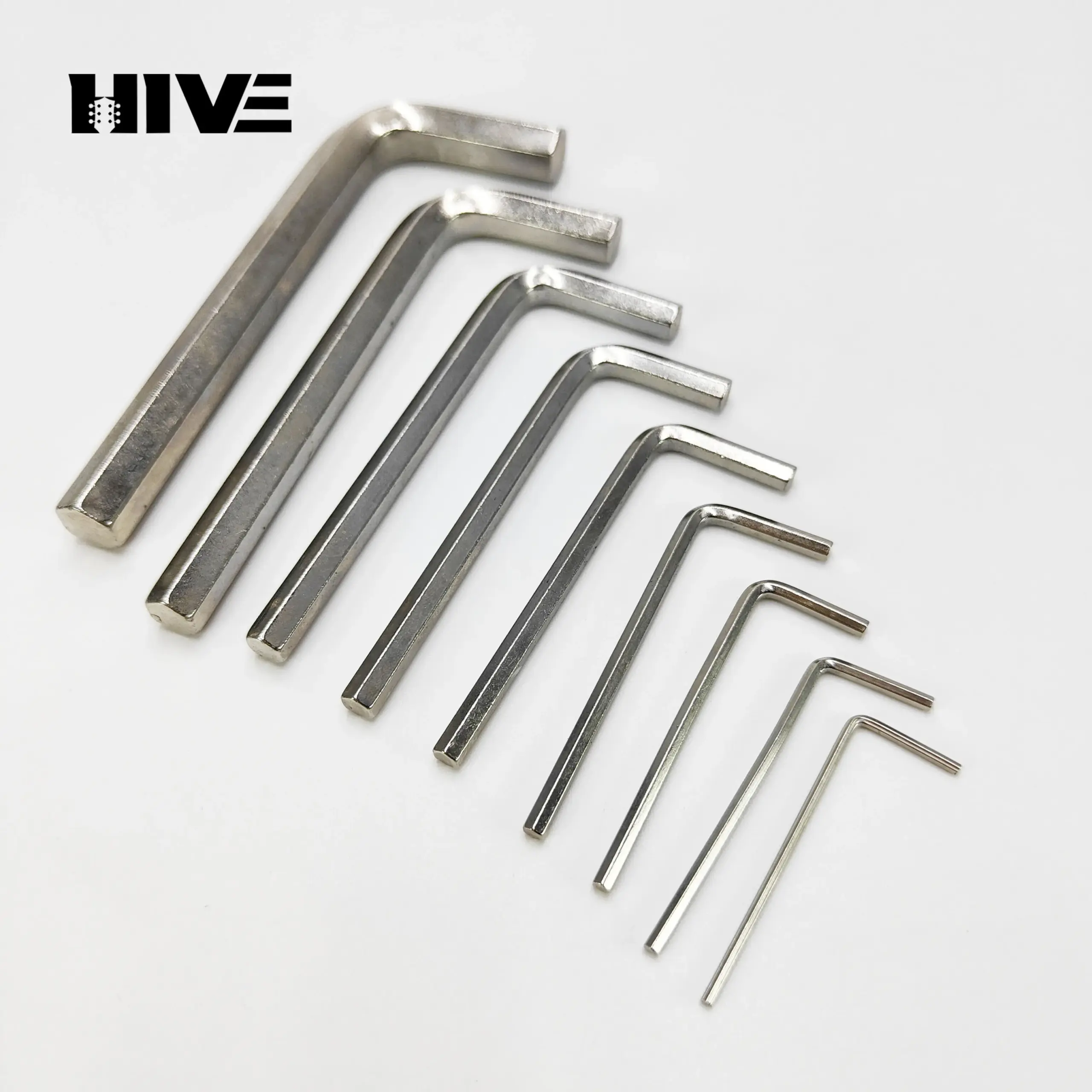 Experience the reliability of this set of nine hex wrenches, designed for precise adjustments on electric guitar string instruments. Crafted from polished chisel tool steel, these wrenches feature a sleek, reflective finish that resists corrosion and wear. Each tool displays a hexagonal shape with straight, elongated shafts for optimal grip and control. The set includes both ball head and flat head designs, offering versatile solutions for various tuning and adjustment needs. Organized in a neat, linear arrangement, this collection showcases craftsmanship and robustness suitable for professional or hobbyist guitarists. Whether tightening or loosening components, you’ll appreciate the balance of durability and precision, making tuning smoother and more accurate every time.
