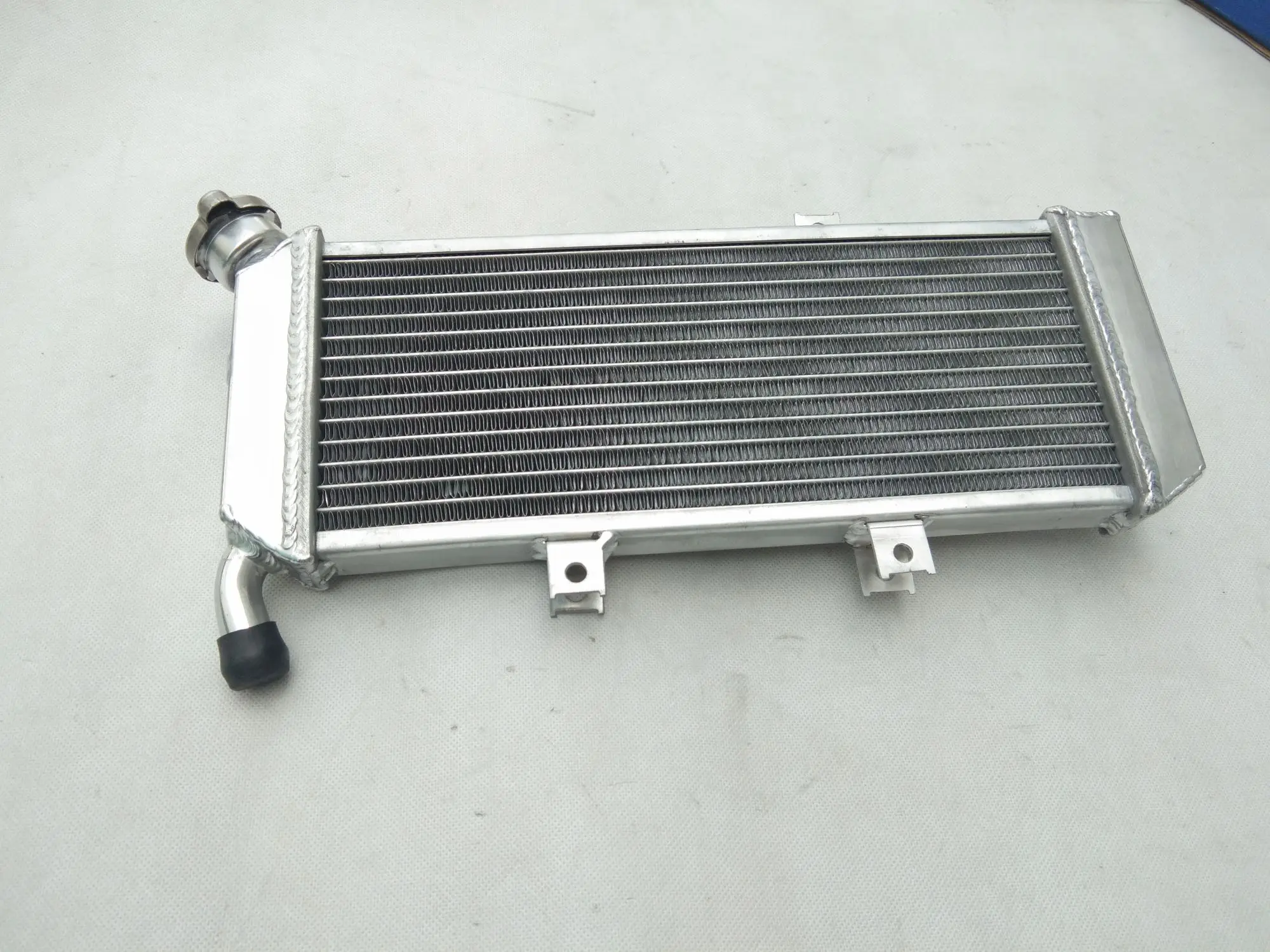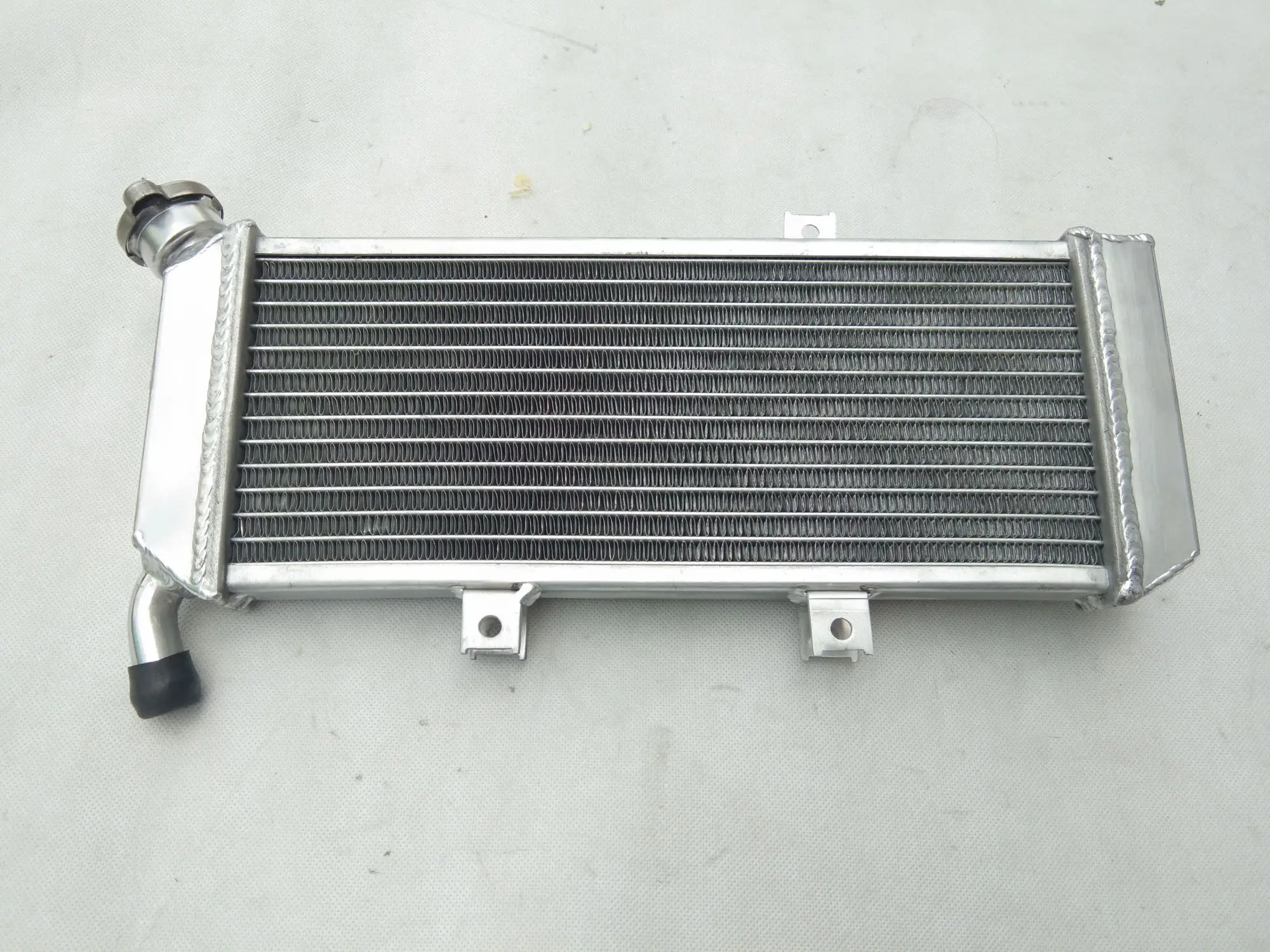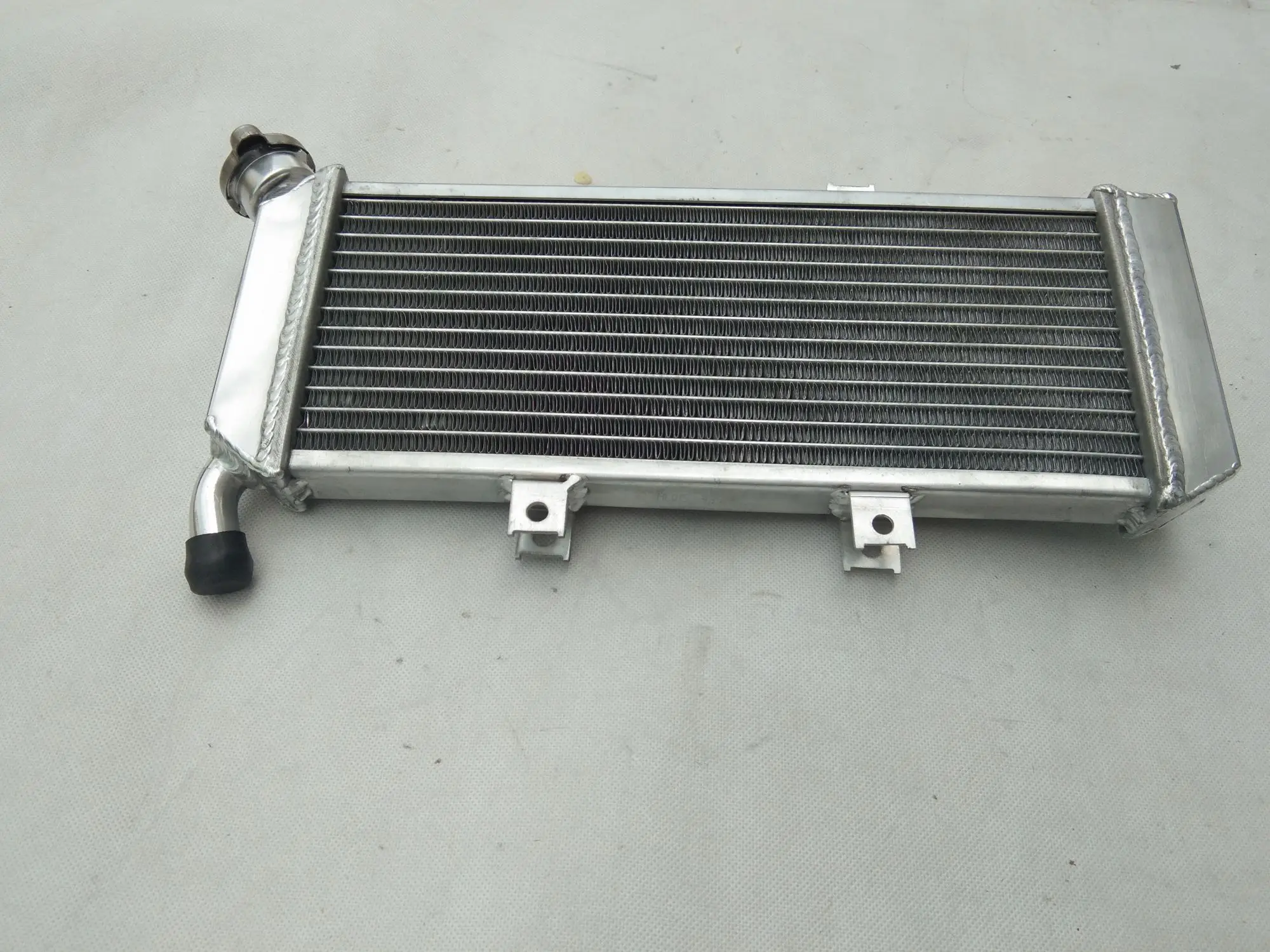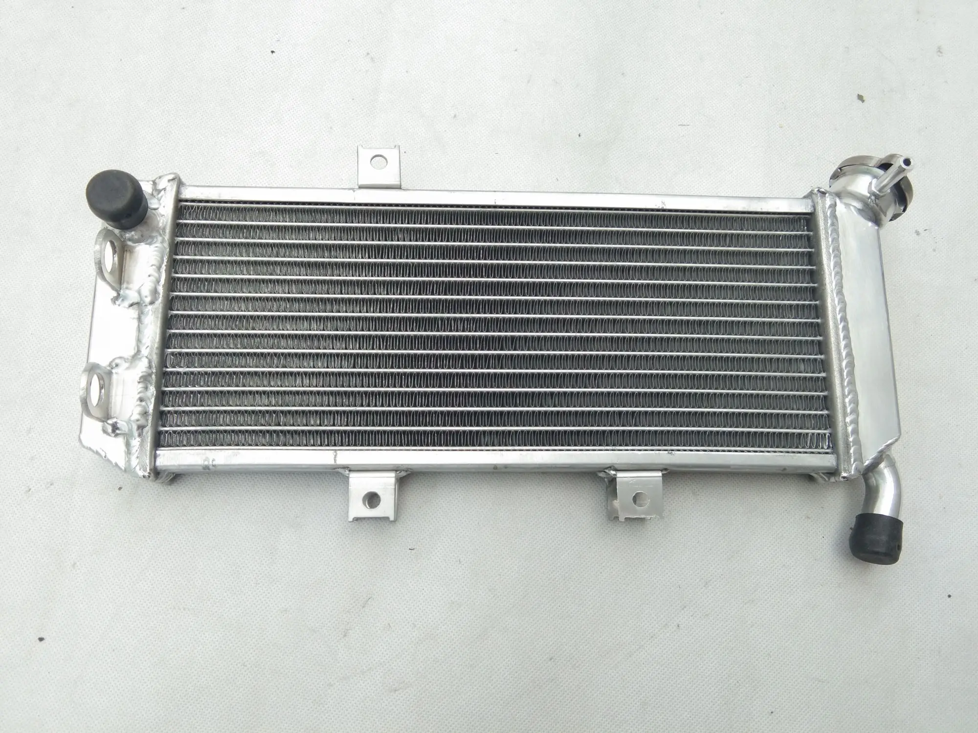 Imagine experiencing enhanced cooling performance and reliability for your 2010 Kawasaki Versys 650 KLE650C with this top-tier aluminum radiator. Crafted from premium T-6061 aluminum, its sleek rectangular design seamlessly integrates into your motorcycle, offering a rugged yet refined aesthetic. The densely packed, horizontally arranged aluminum fins create a finely textured surface optimized for superior heat dissipation. The two sturdy welded pipes—one with a slight curve—are securely attached with high-quality welds and covered with black rubber caps for additional durability. This modern cooling component not only looks industrial and robust but also exceeds OEM standards by providing approximately 40% more cooling capacity. Upgrade your motorcycle’s performance confidently with this heavy-duty, easy-to-install radiator.