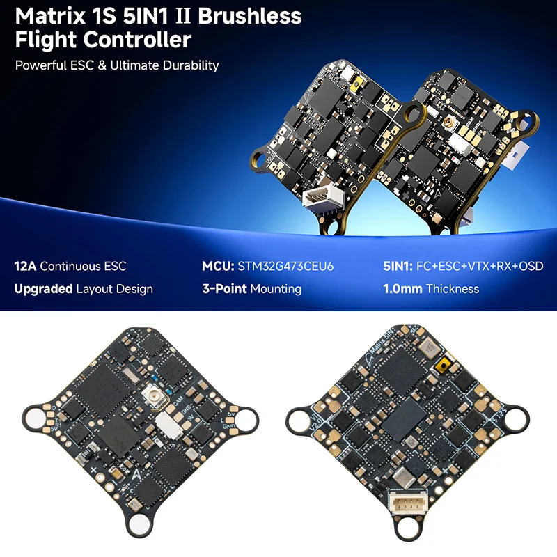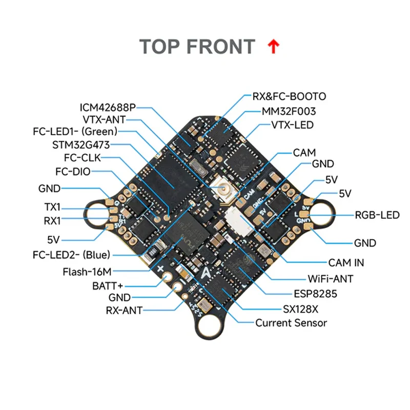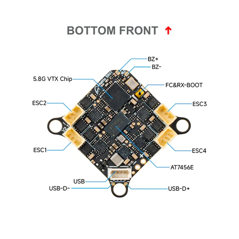 - Built around an STM32G473CEU6 microcontroller with high processing power for precise control and complex maneuvers, ensuring smooth flight performance and reliable operation in all conditions.