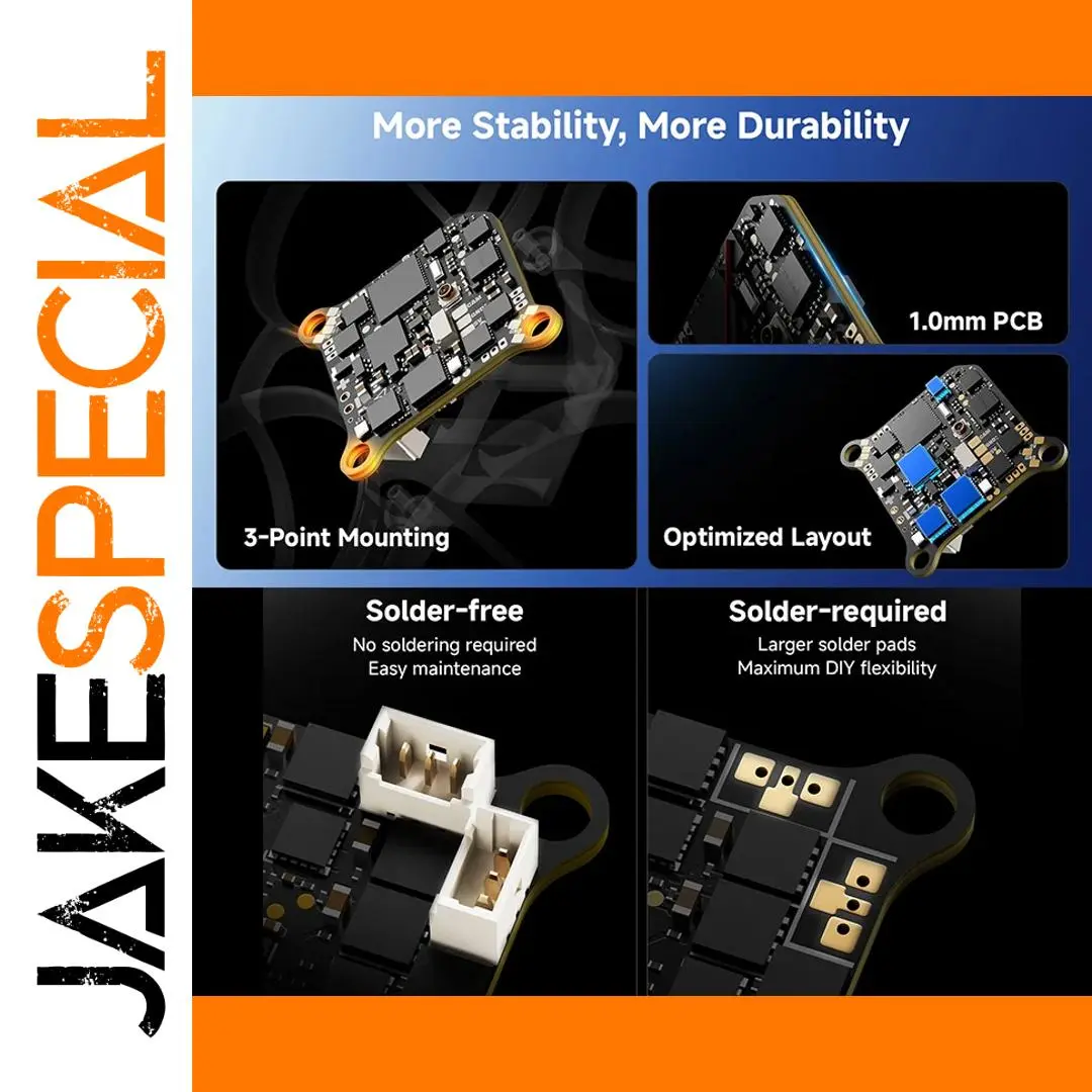 - Flexible build options as solder-free or solder-required, with larger solder pads for custom wiring, and designed for easy installation on a 26mm x 26mm mounting pattern, combining robustness with user convenience.