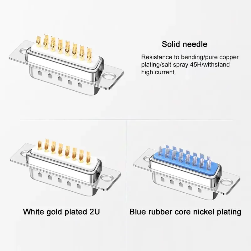 - Technical specs include 15 gold-plated pins, two-row soldering design, compatible with soldering and panel mounting.