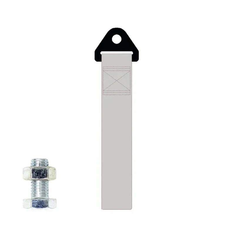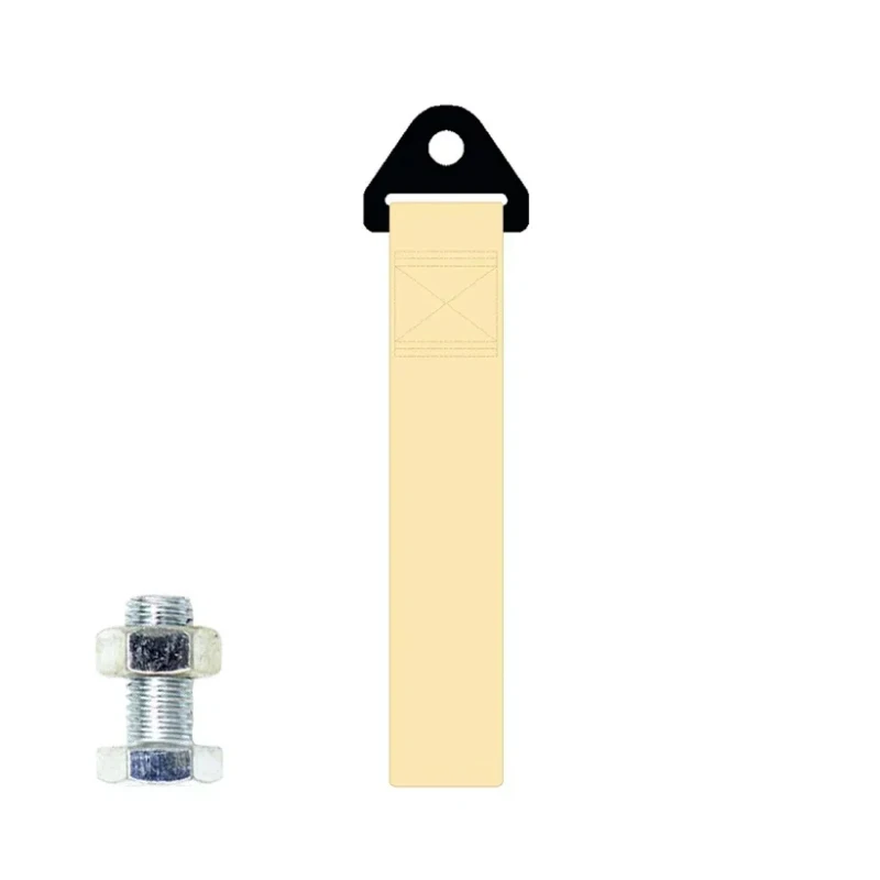 - Designed with a robust, textured nylon strap attached to a sturdy black metal plate with a large bolt and hex nut for maximum holding power.