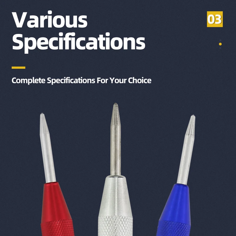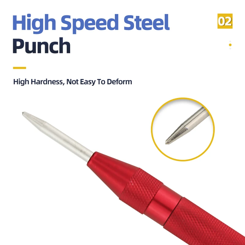 Experience the precision and reliability of this high-quality automatic center punch designed by Tooleye. Crafted from chrome vanadium steel, the tool features a robust head with a hardness of HRC 58-62, ensuring long-lasting durability and excellent impact force. Its spring-loaded mechanism allows effortless marking on various surfaces such as steel, wood, and glass, making it perfect for woodworking, metalworking, and emergency glass-breaking situations. Beautifully finished with a sleek metallic look, it offers an ergonomic grip with knurled details for secure handling. Available in multiple colors and sizes, this versatile tool combines style and function, giving you confidence in your projects or emergency needs. Its compact design ensures easy storage and quick access whenever necessary.