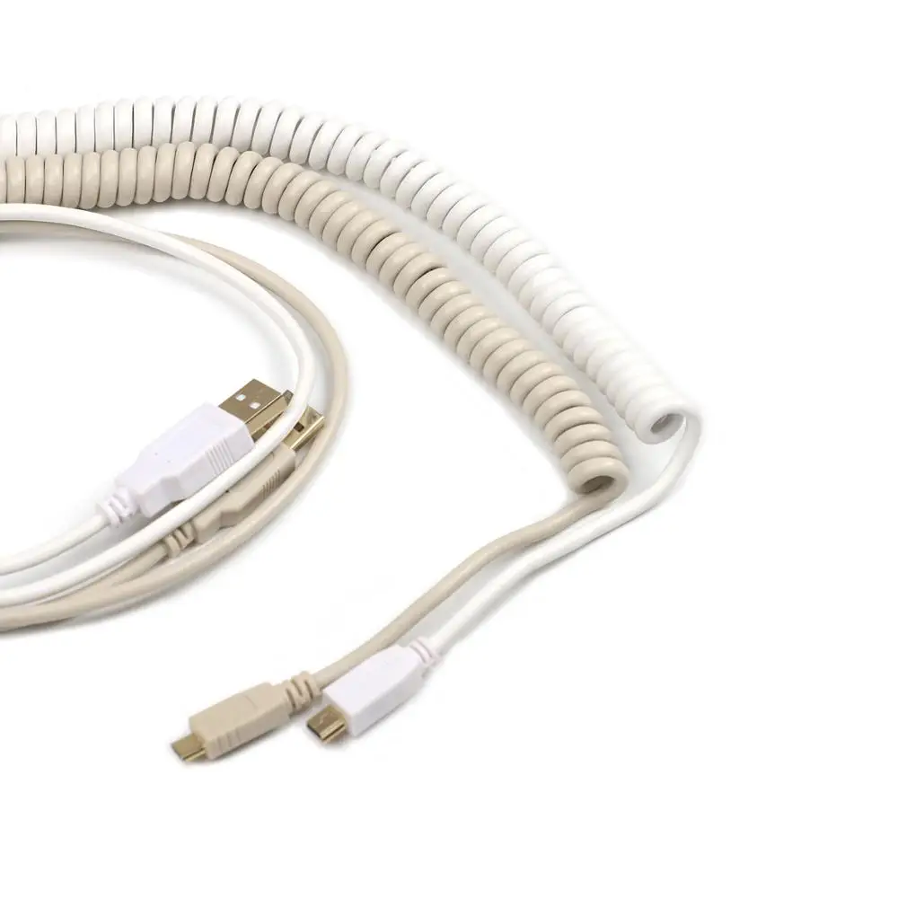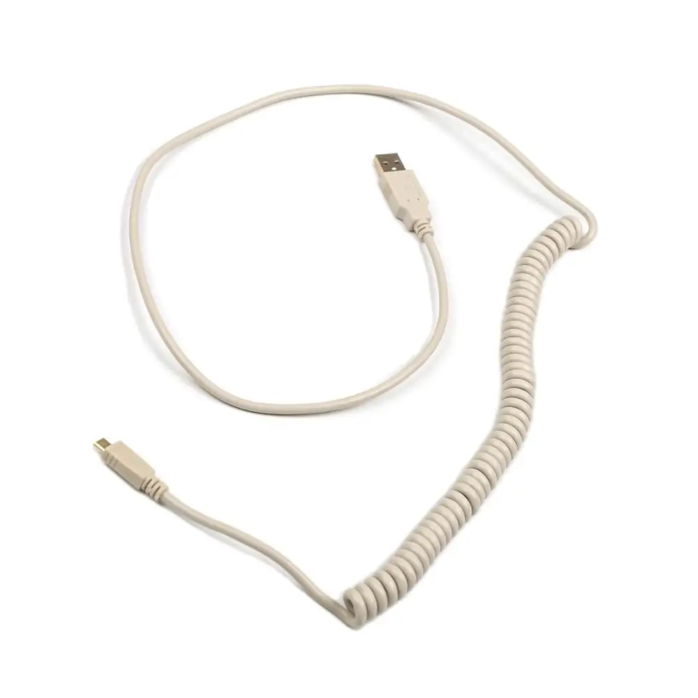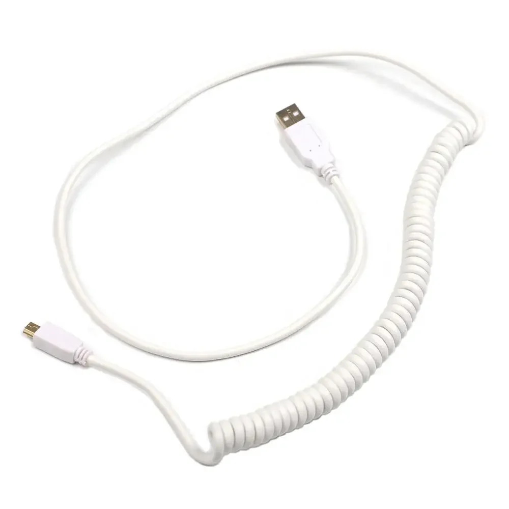 Enhance your mechanical keyboard setup with this durable, coil-style USB data cable available in Black Type C, Light Gray Mini B, Light Gray Type C, White Mini B, and White Type C options. Designed with one end featuring a Type C connector and the other with a Mini B, the cable extends from approximately 2 to 2.8 meters when stretched, providing flexible length for comfortable use. Crafted from high-quality materials, it features a sleek, smooth surface with a subtle matte finish, ensuring durability and a modern aesthetic. The protective film on the connectors can be peeled off for a clean look, making it an ideal accessory for seamless data transfer and customization in your keyboard setup.