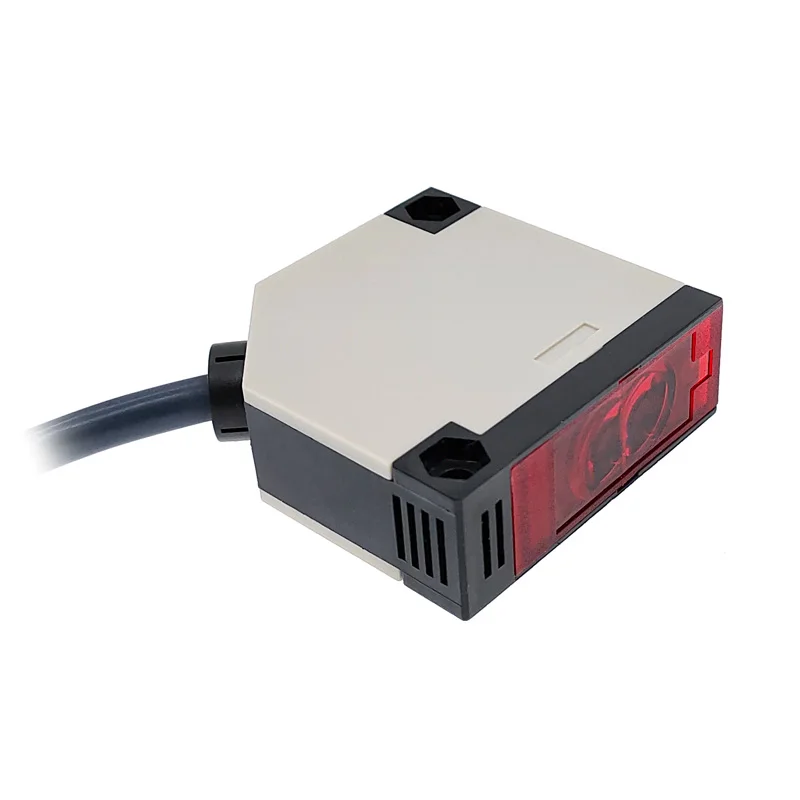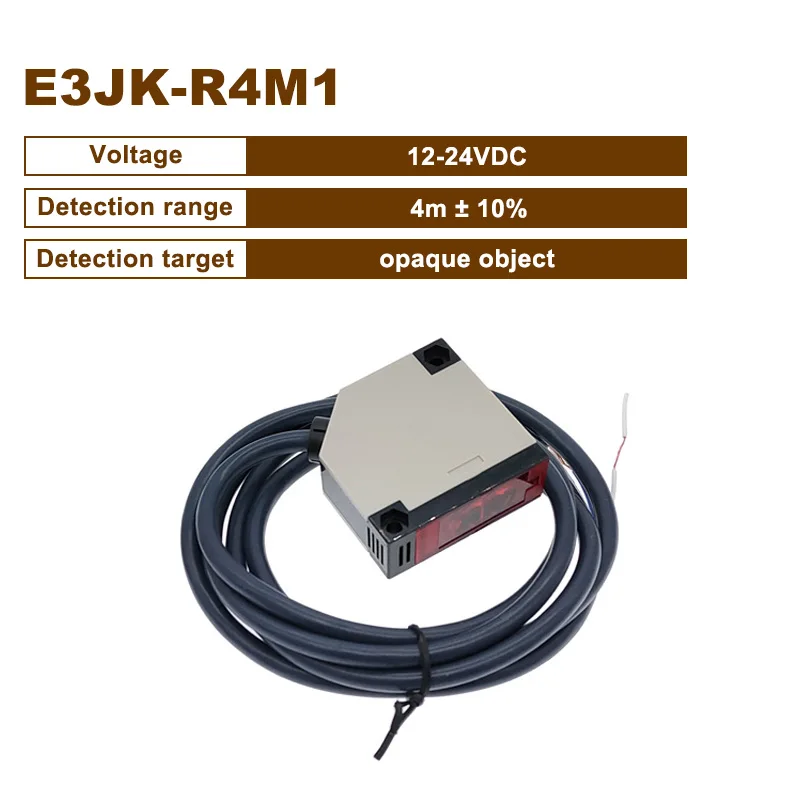 This durable photoelectric switch features a sleek rectangular plastic housing with a matte finish available in various models, including E3JK-R4M1/2 and E3JK-DS30M1/2, designed for diffuse reflection infrared detection. Operating on DC24V or AC220V with a voltage range of 24V to 220V, it offers a 3A current rating and low-voltage classification below 50Vac or 75Vdc. Its minimalist, industrial aesthetic includes a slim sensing window, a contrasting metallic mounting bracket, and a red indicator light, making it ideal for precise, fixed installations in various control systems.