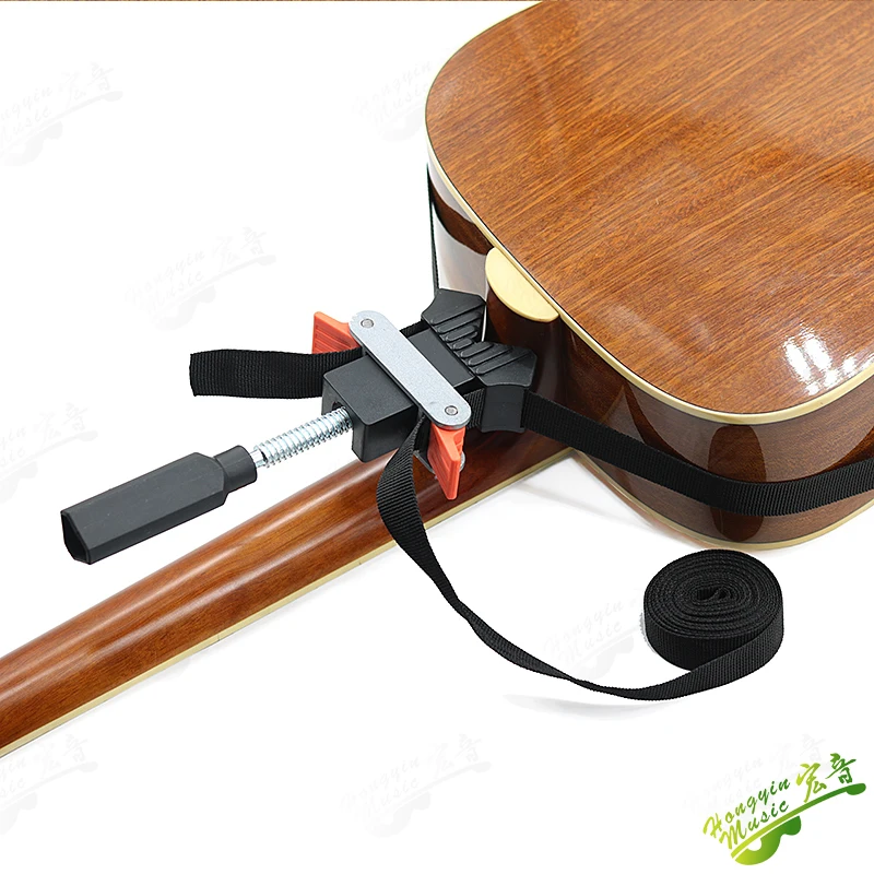 Experience precise and reliable guitar repair with this innovative repair jig designed specifically for cracks and unglued seams in guitar necks and bodies. Crafted with adjustable fixtures, it provides a comfortable clamping force of approximately 2000kg, ensuring strong bonds without damaging your instrument. The sleek black finish and textured gripping areas give it a professional, industrial look, emphasizing durability. Its versatile design accommodates both large and small guitar sizes, making it a must-have for any guitar technician or enthusiast. Included with the jig is a 15ml tube of high-quality glue for seamless adhesion. Designed for easy operation, this tool allows smooth, gentle pressing, perfect for repairing backplates, shoulders, and sound barrels, ensuring your guitar retains its original sound and appearance.