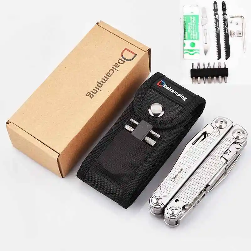 Experience the versatility and durability of this 310g multi-tool set featuring a foldable, high-quality metal construction. It includes robust pliers with a 130 kg maximum twisting force, a serrated knife made from 58CR4 steel, and a straight knife crafted from 7Cr17 steel with HRC55-58 hardness. The set also offers an array of screwdrivers (PH1, PH2, SP8, SP43, TT25, TT20, TT15, TT10, SL6, SL5, SL4, SL3, H5, H4, H3, H2.5, H2), saws, scissors, openers, needles, and bits, all made from high-strength 3Cr13 steel with HRC50-54 hardness, and ergonomic handles from 2Cr13 steel. Designed for outdoor, survival, or household use, this multifunctional set is suitable for wet, saline, or alkaline environments with proper maintenance.