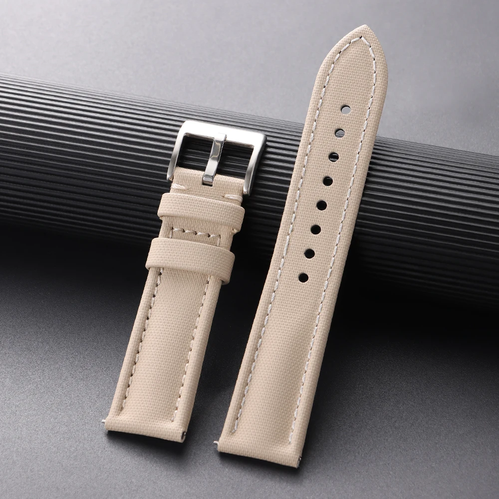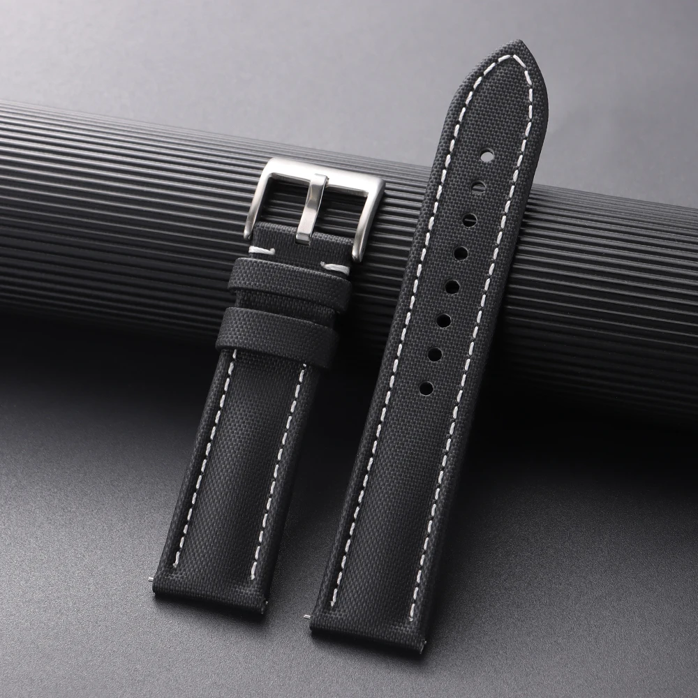 Experience the perfect blend of functionality and style with this high-quality sailcloth watch strap, designed specifically for diver watches. Crafted from rugged sailcloth material, it offers exceptional water resistance and durability, ideal for active lifestyles. The strap comes in a variety of widths—18mm, 19mm, 20mm, 21mm, and 22mm—to ensure a perfect fit on your watch. Its lightweight design at around 20 grams makes it comfortable for all-day wear. The adjustable length of approximately 20cm (125mm + 75mm) and multiple holes allow for a secure and personalized fit. The strap's clean, understated style features white contrast stitching along the edges and a sleek, silver-toned pin buckle. Whether for casual or aquatic use, this strap guarantees both durability and elegance.