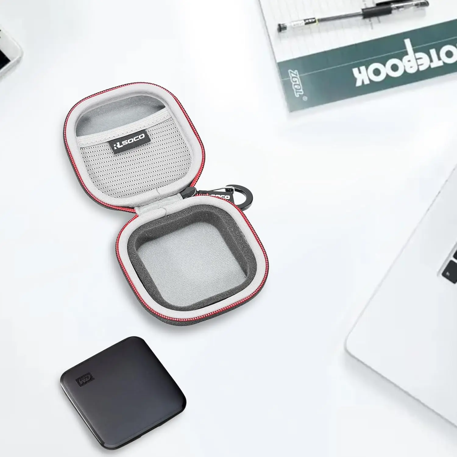 Feel confident knowing your WD 1TB or 2TB Elements SE portable SSD is well protected with this sleek, durable case. Crafted from high-quality EVA and reinforced with 1680D materials, it offers superior shock absorption, safeguarding your valuable data from impacts and scratches. The compact square design keeps your SSD and accessories organized in two separate compartments, preventing movement and damage during travel. The textured light gray exterior is accented by bold red seams, giving it a sporty, modern look, while the dark foam-lined interior provides a sophisticated touch. With a secure zipper closure and an attachable black carabiner, you can carry it effortlessly—attach to backpacks or belts for ultimate convenience. This eco-friendly, Rohs-certified case combines functionality, style, and environmental care seamlessly.