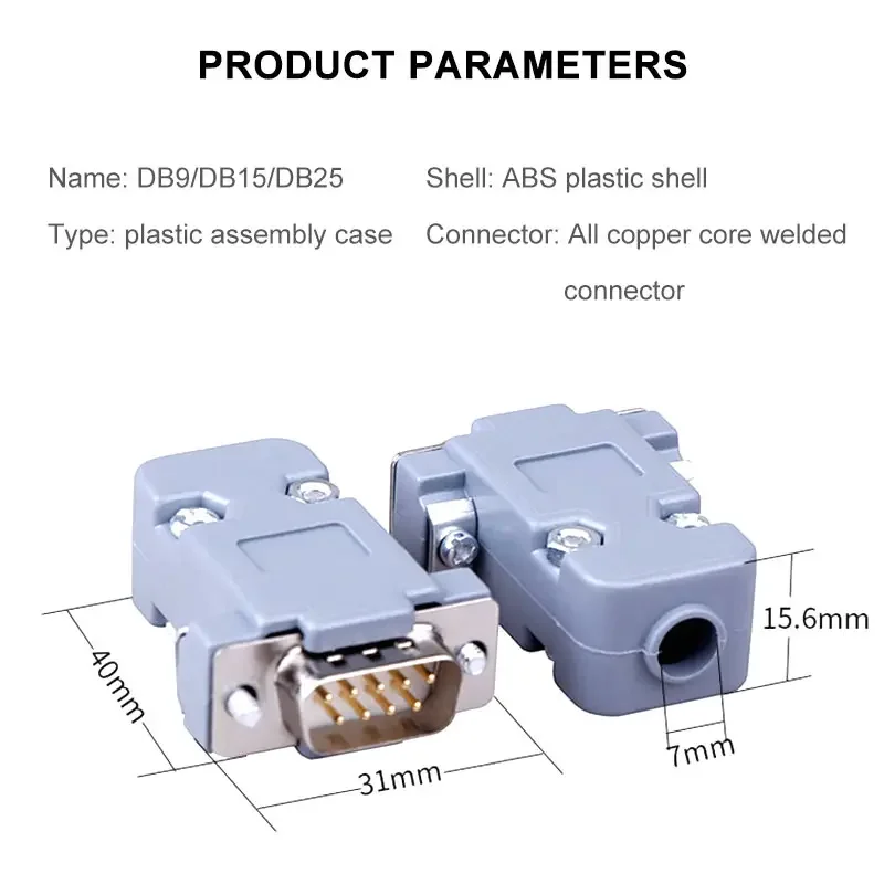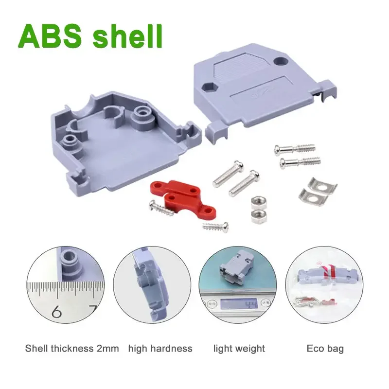 Enhance your connectivity with this robust welding connector available in models for 9, 15, and 25 pins, suitable for male and female serial or parallel ports. Crafted from durable ABS plastic with a sleek, rectangular design, it features a soldering plug interface, ensuring reliable circuit connections. The connector includes options with gold-plated male DB9 for improved corrosion resistance and signal integrity. Operating at 24V, it complies with RoHS and UL certifications for safety and environmental standards. Available in various configurations such as DB15-FS, DB15-MS, DB15-SFS, DB15-Shell, DB15-SMS, DB25-SMS, DB25-FS, DB25-MS, DB25-SFS, DB25-Shell, as well as DB9 variants, it offers versatility for professional industrial applications.
