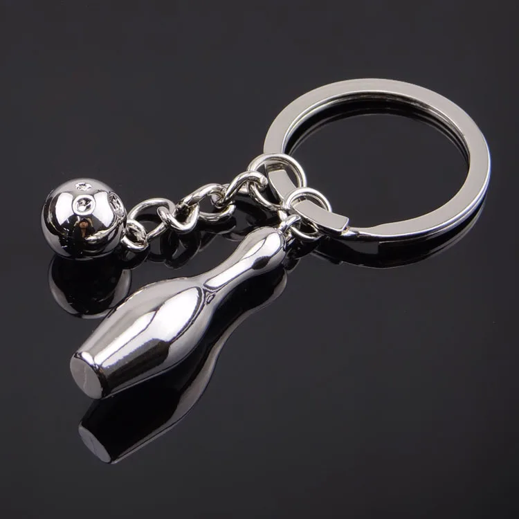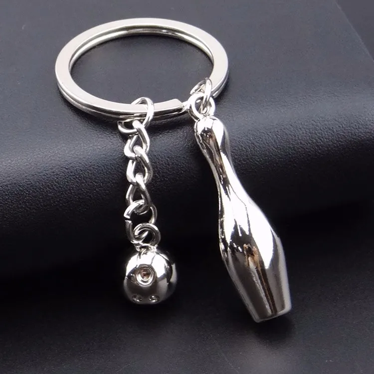 Experience a blend of fashion and fun with this trendy metal keychain, perfect for expressing your personality. Crafted from durable zinc alloy, it features a sleek, round shape with a polished finish that reflects light beautifully. The keychain showcases two metallic charms: a shiny, miniature bowling pin and a highly reflective spherical ball, both with mirror-like surfaces. Available in light yellow gold and black finishes, it adds a touch of elegance while remaining playful. Its compact size and sturdy construction make it an ideal accessory for everyday use, gifts, or souvenirs. The secure O-shaped buckle ensures easy attachment to keys, bags, or zippers, making it a versatile addition to any style or theme, including sports, music, or cartoons.