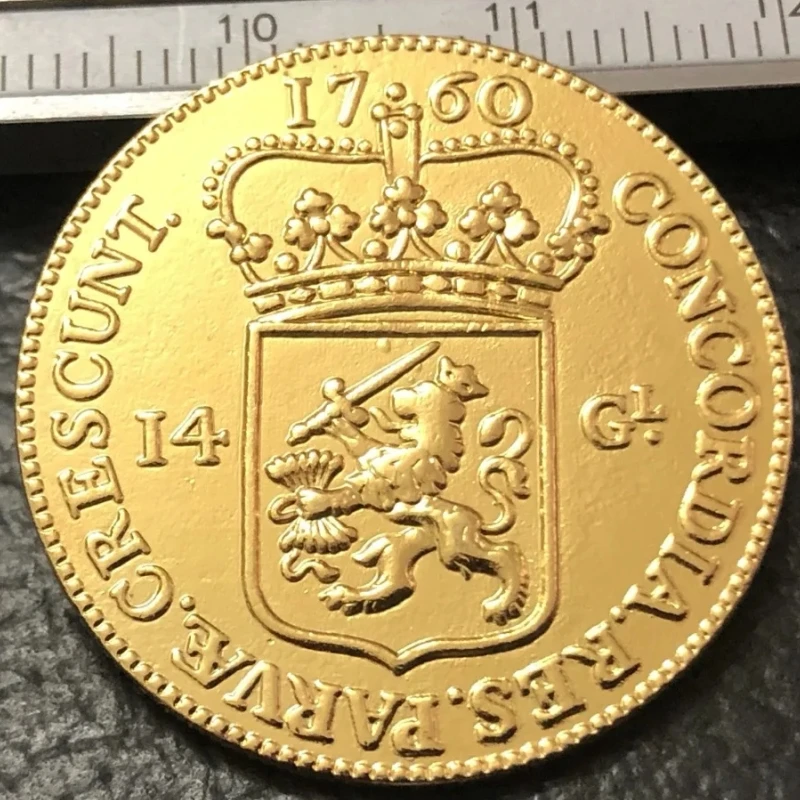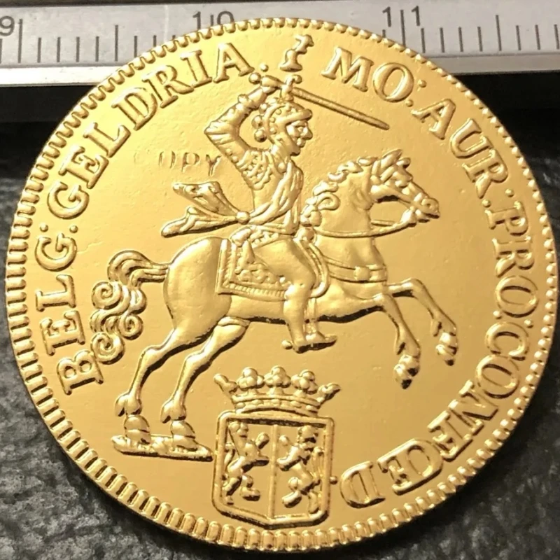 Imagine holding a piece of history in your hands — this meticulously crafted replica captures the grandeur of the 14 Gulden coin from the Dutch Republic, specifically Gelderland. With its rich antique European style, the coin features an intricate embossed coat of arms, showcasing a lion passant clutching a sword beneath a regal crown. The textured, matte background highlights polished details, giving a striking contrast that emphasizes craftsmanship. Encircling the design is a Latin inscription, “CONCORDIA RES PARVAE CRESCUNT,” evoking patriotism and historical pride. Made through casting techniques, this coin is a remarkable collector’s piece that embodies European regal aesthetics and patriotic heritage, blending detailed artistry with historical significance.