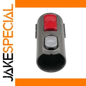 - Its color scheme includes a matte gray surface accented with a bright red oval-shaped button, giving it a stylish appearance that complements modern Dyson vacuums and accessories.