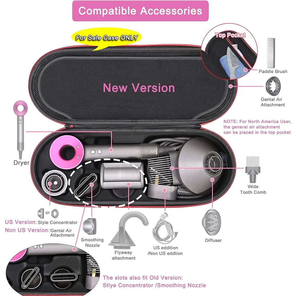 Imagine confidently traveling or storing your Dyson Supersonic hair dryer with this sleek, durable case that keeps everything organized and protected. Crafted from high-density EVA combined with 1680D materials, it offers exceptional impact resistance and sturdy protection against everyday bumps. The interior features custom-molded, precise slots designed for the main dryer body, gentle air attachment, style concentrator, diffuser, and nozzles—keeping all accessories secure and orderly. Additionally, a zipper pocket provides extra space for small tools or accessories like combs or clips. Available in classic black or vibrant pink, this eco-friendly, RoHS-certified case seamlessly combines premium protection with a modern aesthetic, making it an essential travel companion or storage solution for your Dyson hair dryer.