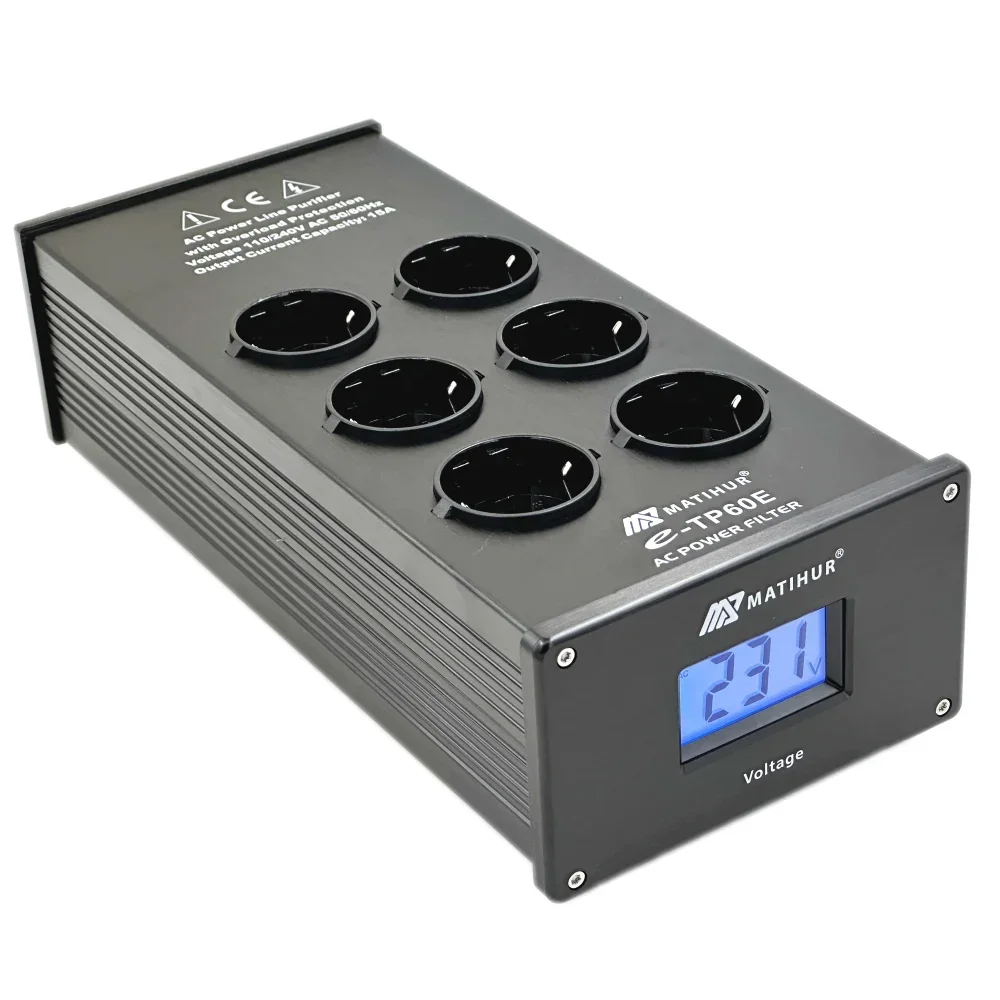 Transform your electronic setup with this premium e-TP80 audio noise AC power filter and power conditioner. Crafted with a durable aluminum housing and engineering ABS plastic components, it offers both strength and safety. The minimalist modern design features six glossy black EU sockets arranged in two neat rows, providing reliable power outlets supported by high-purity phosphor bronze contacts. The bright blue LCD screen displays real-time voltage, enhancing visibility and precision. With a rated power capacity of up to 3000W and support for 15A currents at 220V, this device ensures high performance. Its robust build and advanced filtering technology effectively eliminate noise, improve sound quality, and stabilize power for sensitive audio and electronic equipment. Perfect for professional studios and high-end residential use.