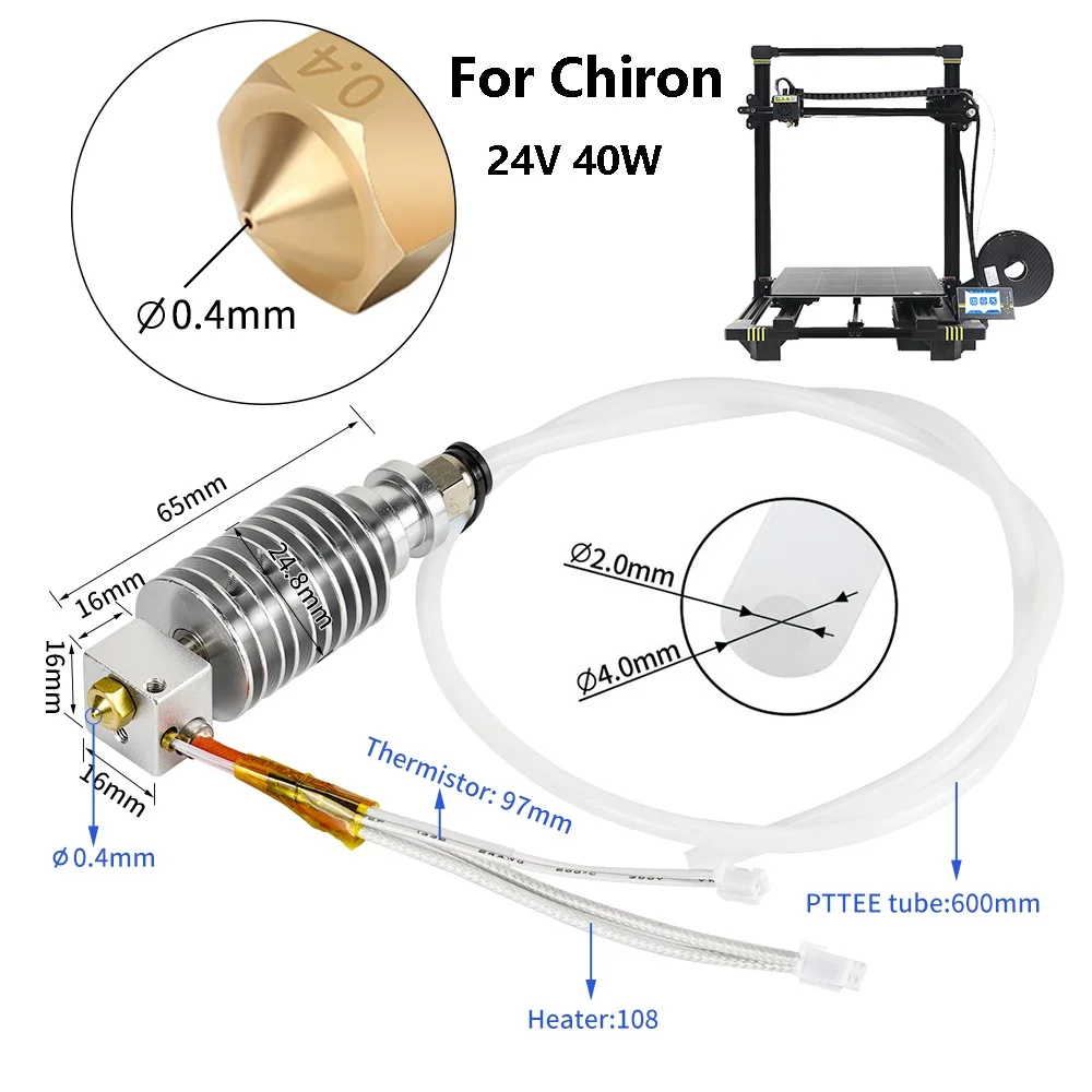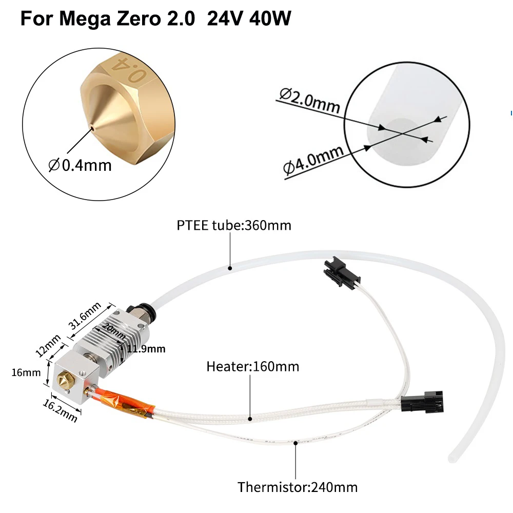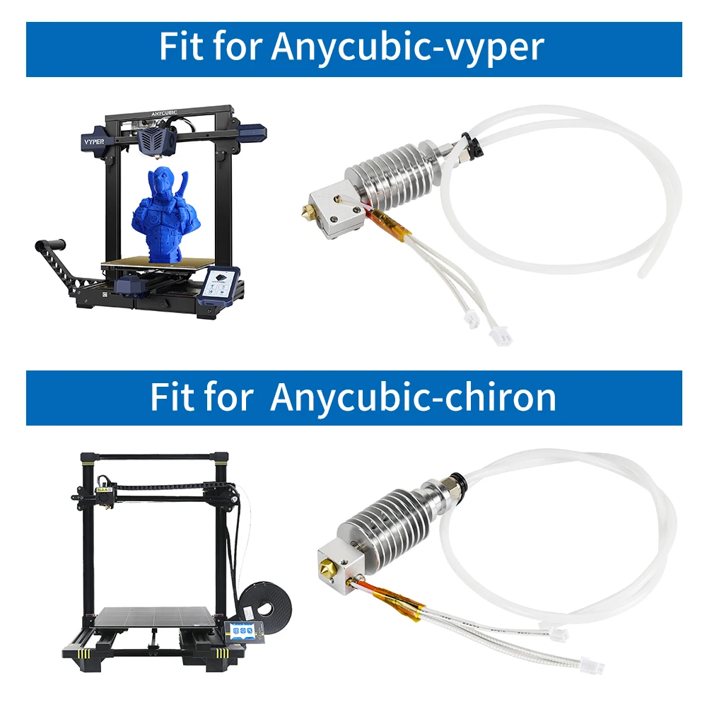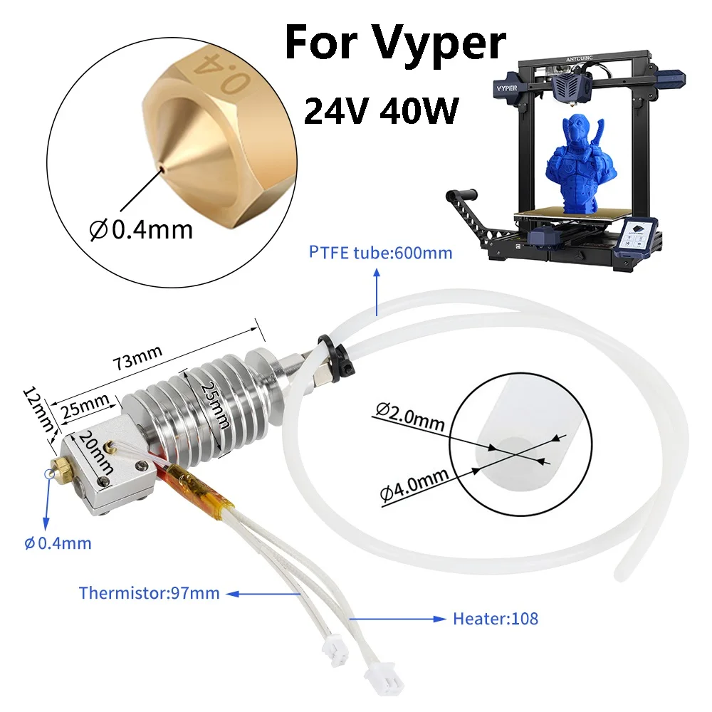 The 12V/24V 40W Mega Print Head Hot End E3D V5 Hotend Kit is a high-performance component compatible with Anycubic Mega, Mega Zero 2.0, Chiron, and Vyper 3D printers. This kit features a J-head design, a heater cartridge rated at 24V for Vyper, Chiron, and Mega Zero 2.0, and 12V for the Mega, providing powerful 40W performance. The nozzle has a diameter of 0.4mm and is designed for 1.75mm filament. With a 100mm long thermistor and constructed from durable aluminum, this complete print head assembly ensures reliable and efficient printing for your 3D projects.