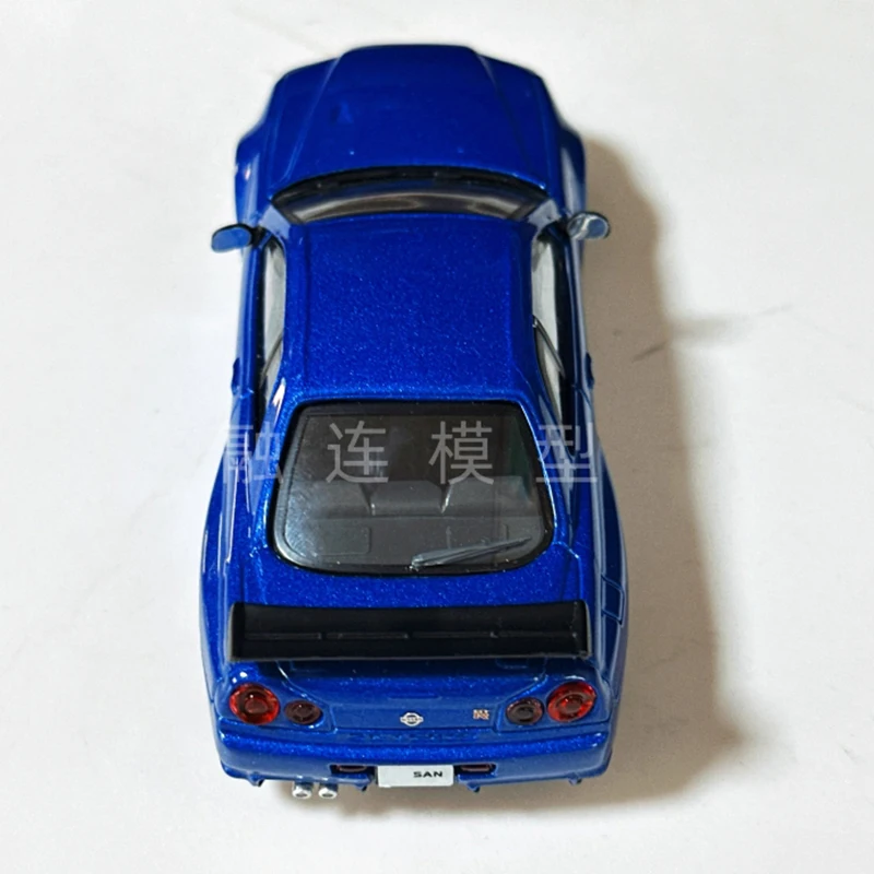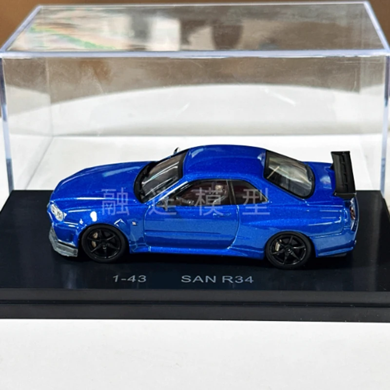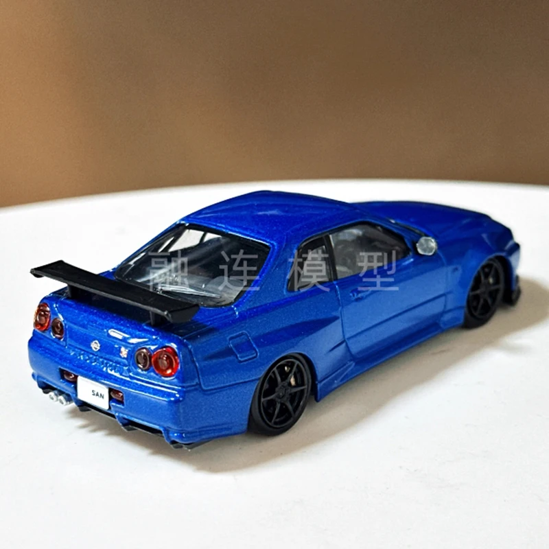 This exquisite 1/43 scale model of the GT-R R34 sports car by Ebbro showcases a vibrant blue color and a glossy finish that reflects craftsmanship and detail. The sleek, aerodynamic design features smooth curves and defined contours, with a prominent grille and distinctive rear spoiler enhancing its sporty character. Mounted on stunning black alloy wheels, the model beautifully contrasts with the body, while the textured tires add realism. Constructed from durable metal alloys and plastics, this static model is perfect for collectors, ensuring a sturdy display. A clear plastic case protects it, showcasing its elegance while making it an ideal decorative piece or gift.