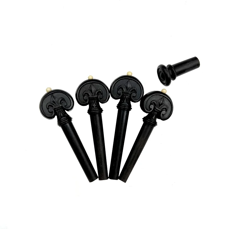 - Small, cream-colored endpins attached at the top of each peg provide functional support while contrasting beautifully with the black ebony, enriching the overall aesthetic.