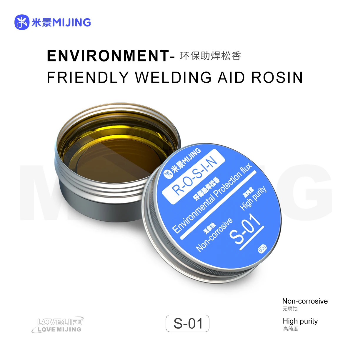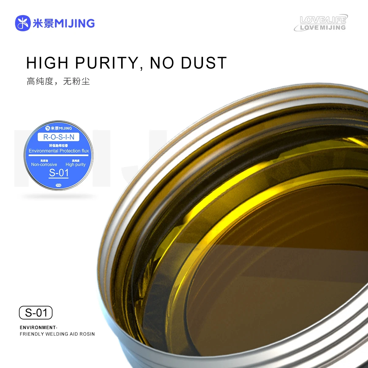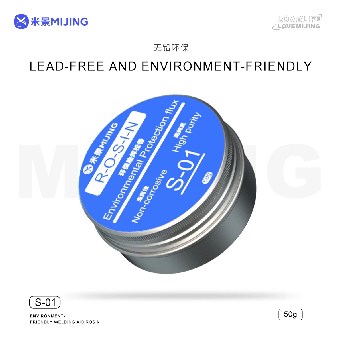 Experience a high-quality, eco-friendly soldering flux with this this environmentally friendly soldering flux, available in models S-01 and T-01. Designed for precise repair work, it offers a smooth, golden-yellow viscous liquid that ensures optimal soldering performance. The product comes in a sleek, metallic round tin container measuring 60×29mm, with a ridged edge for secure closure. The vibrant blue label highlights its key features—non-corrosive, high purity, and dust-free—making it an ideal choice for professional and DIY applications. This soldering flux not only prevents oxidation but also ensures safe, lead-free soldering, emphasizing safety and environmental care. Trust this reliable flux to deliver clean, efficient, and durable solder joints every time.