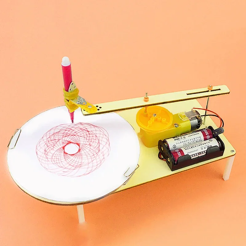 Imagine inspiring young minds with this engaging educational drawing robot kit, perfectly designed for ages 3-12. Crafted from durable multi-materials, it features a compact 16cm x 24cm wooden base with vibrant yellow plastic accents that add a cheerful touch to its simple, functional design. The electric plotter mechanism powers intricate geometric patterns with a red marker, creating captivating visuals as the robot draws complex, overlapping lines on circular paper. Ideal for fostering interest in electronics and automation, this kit combines natural wood tones and lively primary colors for an inviting, hands-on learning experience. Please note, a compatible battery (not included) is required for operation.