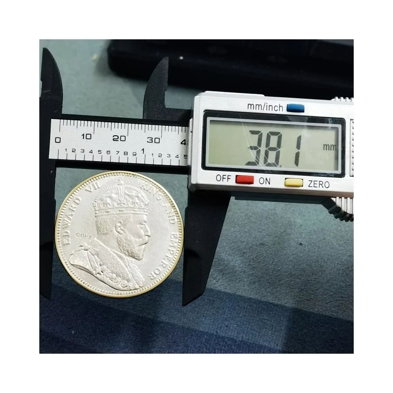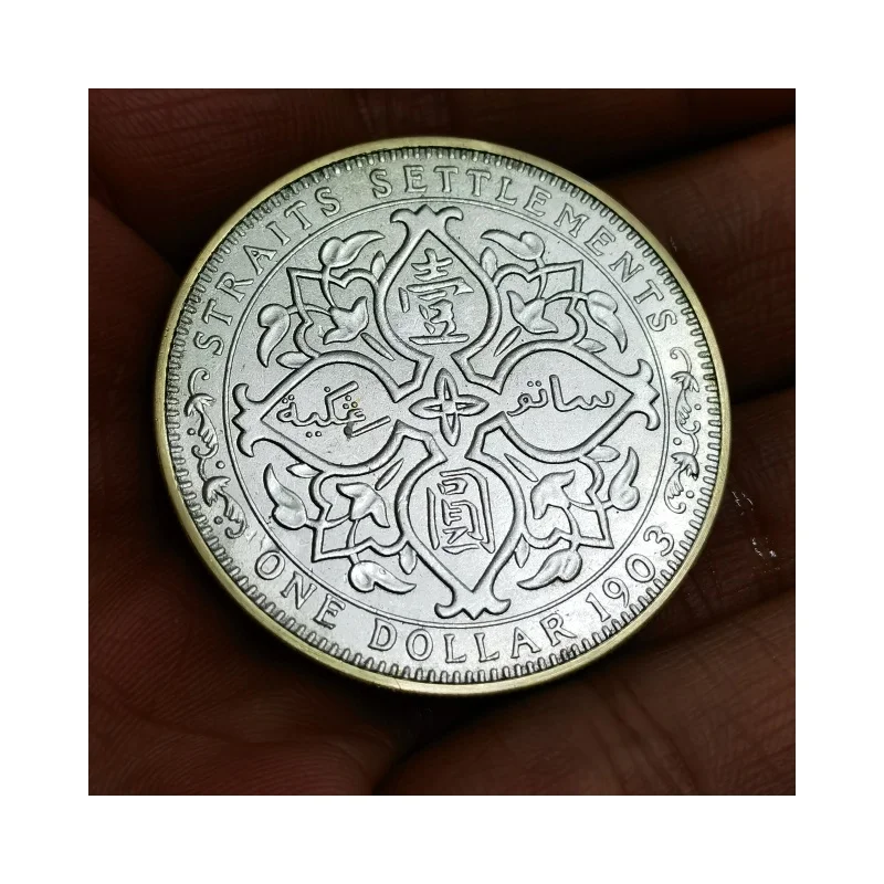 This beautifully crafted replica coin from 1903 captures the historic charm of the Straits Settlements era. Made of 90% silver, it features a high-relief portrait of King Edward VII facing right, wearing a detailed crown and regal attire adorned with intricate patterns. The surface showcases a vintage, slightly textured finish, evoking an antique feel, perfect for collectors seeking nostalgic and retro aesthetics. The coin’s design includes a raised inscription, “EDWARD VII KING AND EMPEROR,” surrounding the portrait, with a reeded edge that adds to its authentic appearance. Whether displayed or kept as a collectible, this piece beautifully embodies early 20th-century regal history and craftsmanship, making it a valued addition to any collection of historical memorabilia or decorative items.