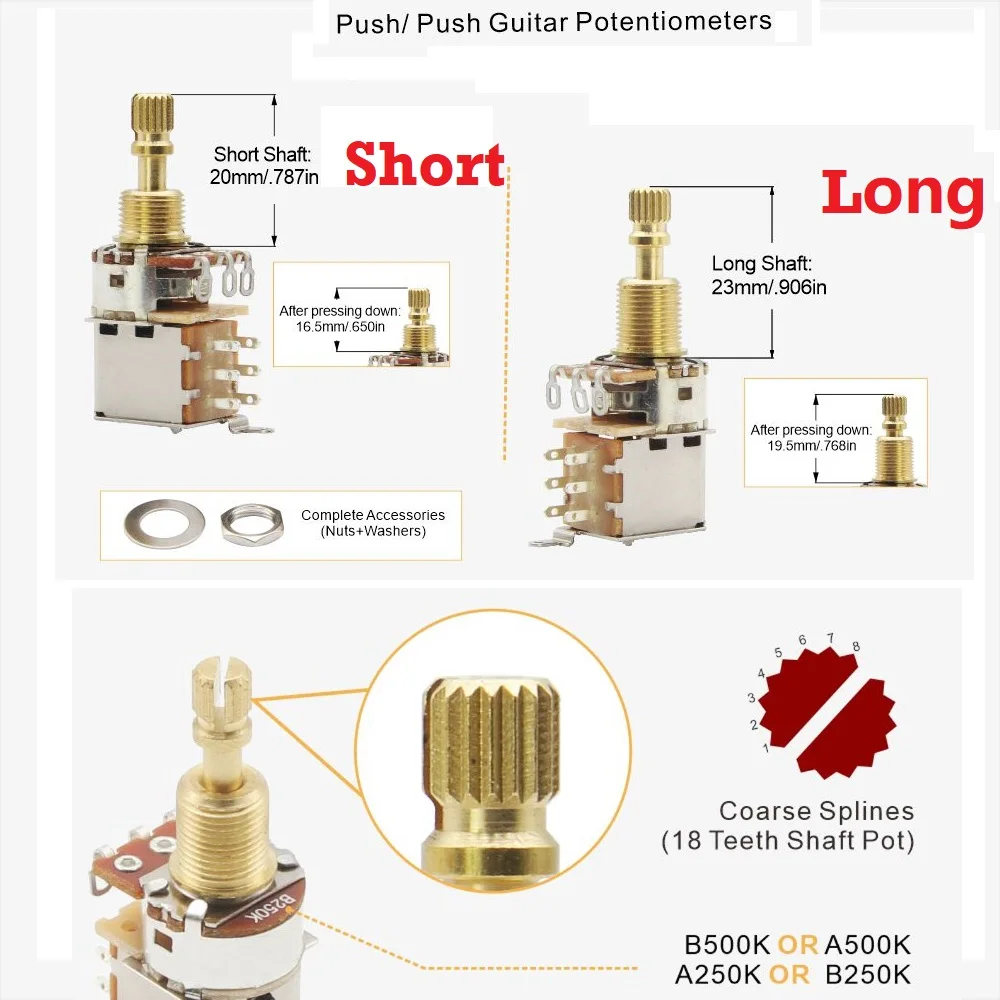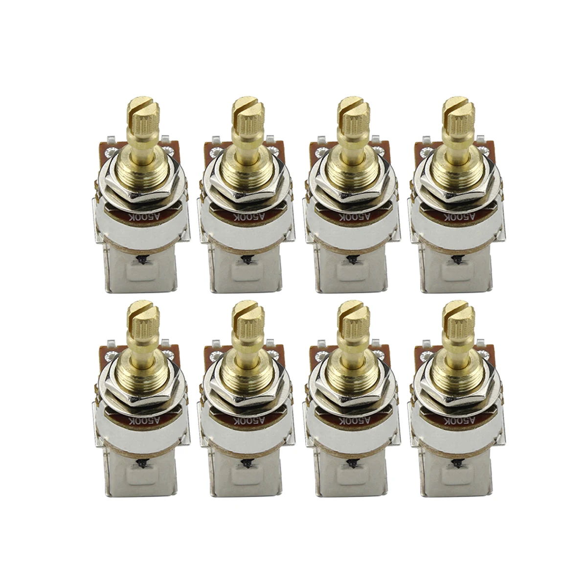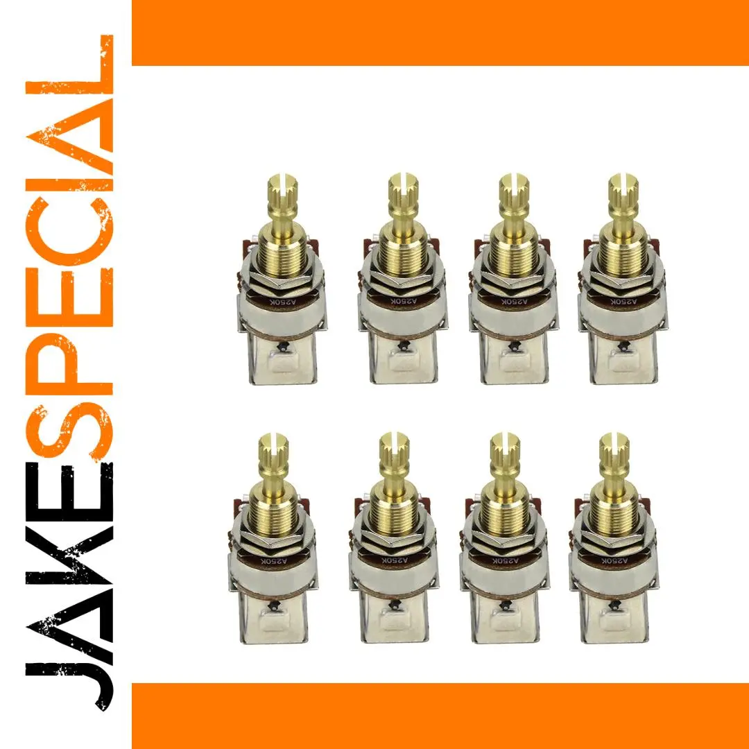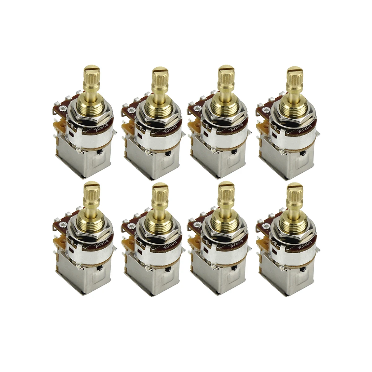 Experience seamless control and durability with this set of eight high-quality push-push guitar potentiometers. Perfect for custom wiring projects, they feature sleek metallic finishes with brass-colored knobs and robust copper shafts, adding a professional look to your instrument. These potentiometers offer resistance options of 250K or 500K ohms and come with both audio and linear tapers, catering to your tonal preferences. The push-push design simplifies switching between modes such as coil tapping, phase, and series/parallel configurations. Their sturdy metal bases, approximately 17mm in diameter, and threaded shafts with included nuts and washers ensure secure installation in pickguard or control plate setups. Elevate your guitar wiring with this dependable and elegant component set.