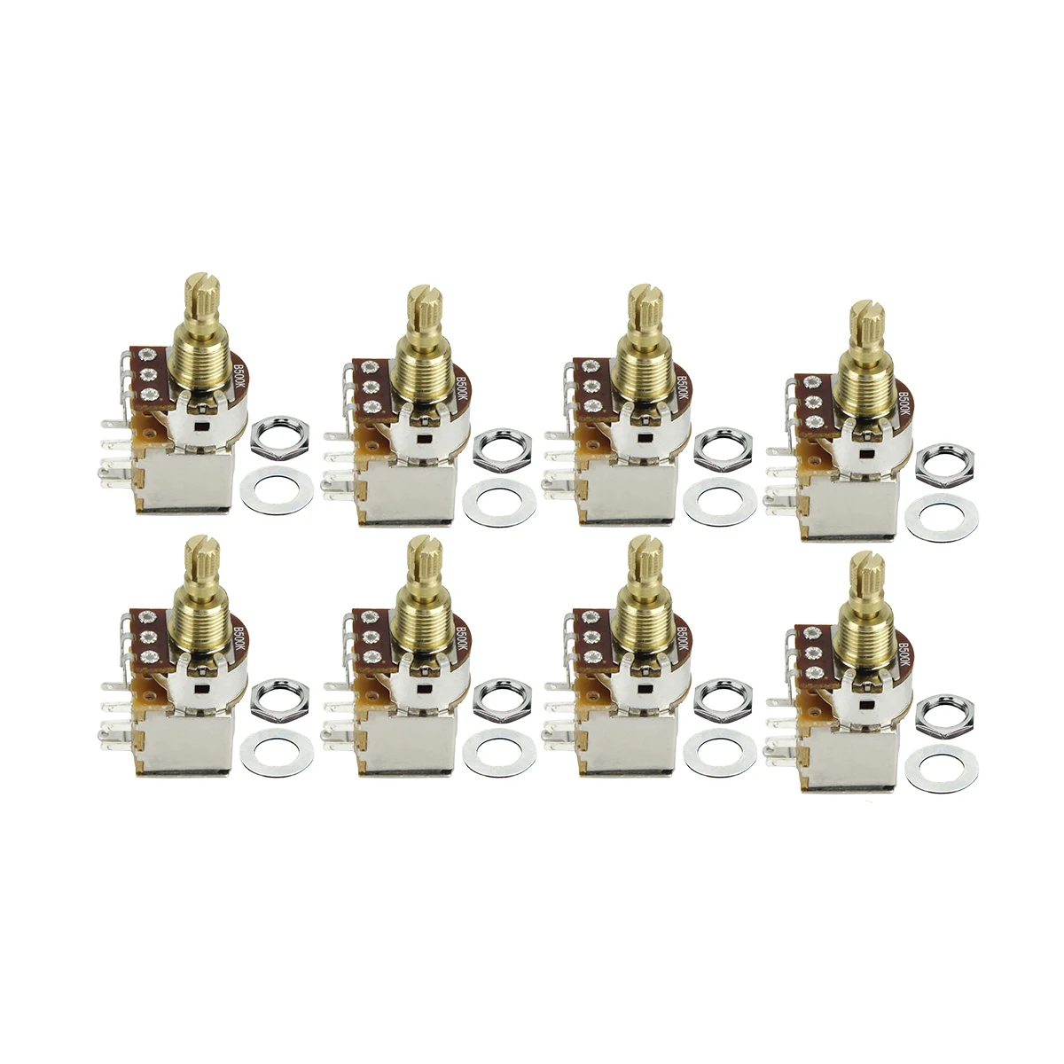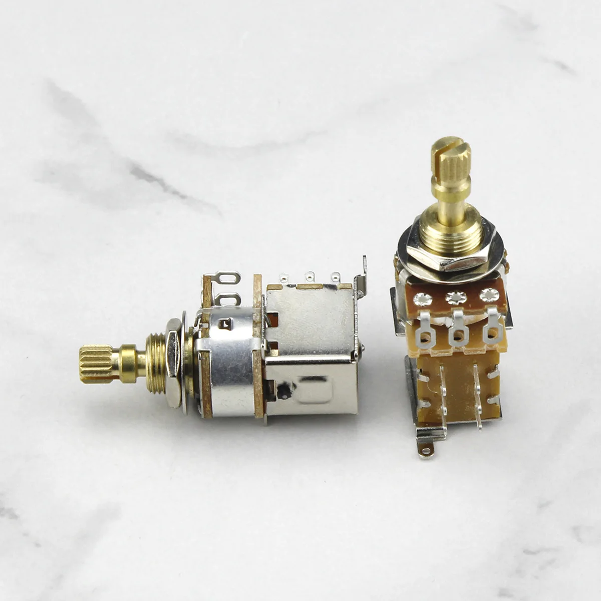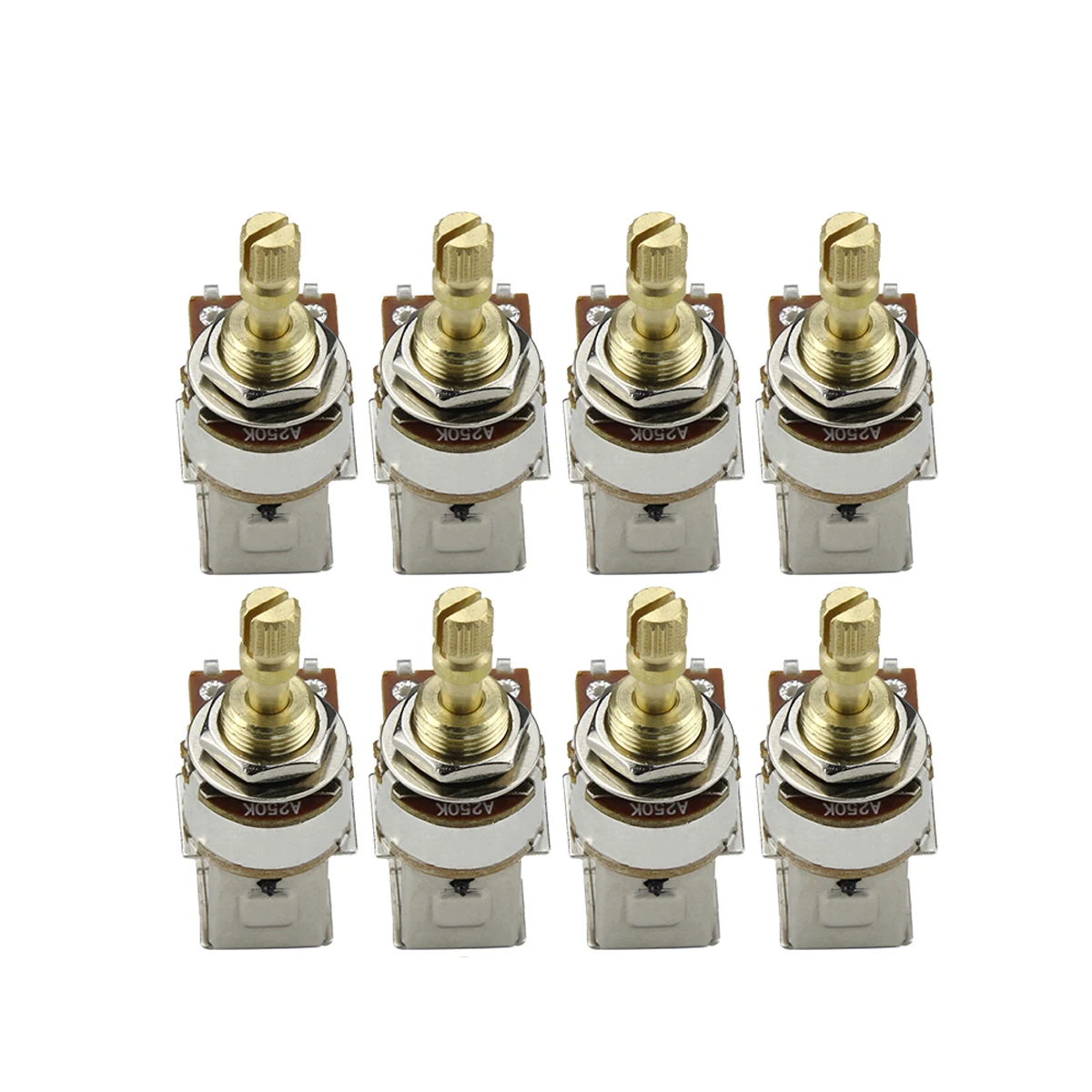 Experience seamless control and durability with this set of eight high-quality push-push guitar potentiometers. Perfect for custom wiring projects, they feature sleek metallic finishes with brass-colored knobs and robust copper shafts, adding a professional look to your instrument. These potentiometers offer resistance options of 250K or 500K ohms and come with both audio and linear tapers, catering to your tonal preferences. The push-push design simplifies switching between modes such as coil tapping, phase, and series/parallel configurations. Their sturdy metal bases, approximately 17mm in diameter, and threaded shafts with included nuts and washers ensure secure installation in pickguard or control plate setups. Elevate your guitar wiring with this dependable and elegant component set.