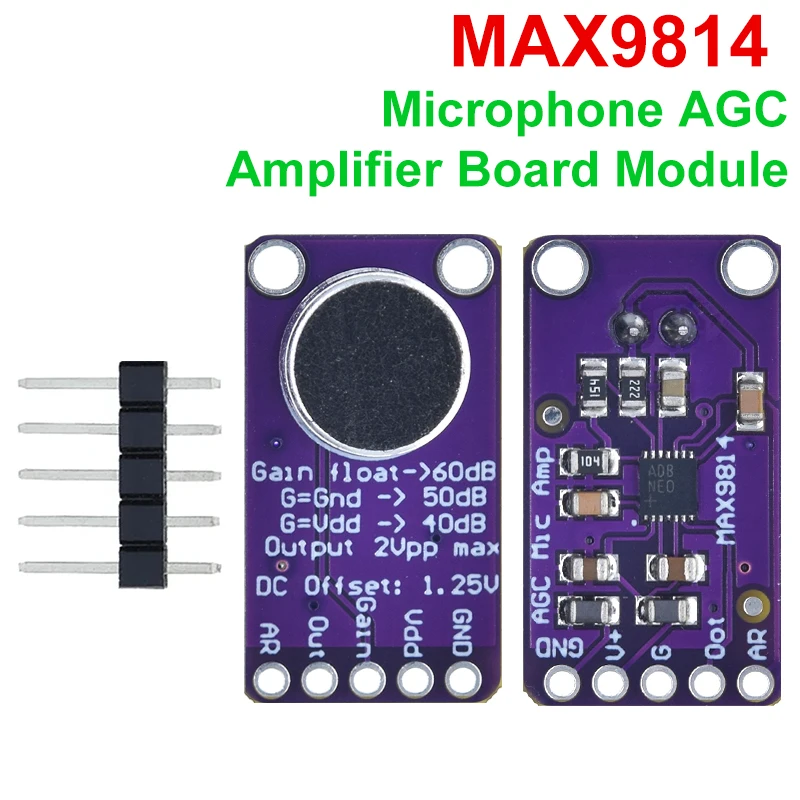 Experience enhanced sound detection with this set of 1 or 3 electret microphone amplifier modules featuring the MAX9814 chip with auto gain control (AGC). Crafted in a striking vibrant purple, each module showcases a large, centrally positioned black microphone element, surrounded by four mounting holes for secure installation. The sleek design includes a detailed bottom circuit with surface-mounted resistors, capacitors, and a small MAX9814 IC, complemented by a precise 5-pin header for easy integration into DIY projects. Operating within -40°C to +85°C, these modules are ideal for switches, sensors, and electronic applications on STM platforms, offering reliable performance for enthusiasts and professionals alike.