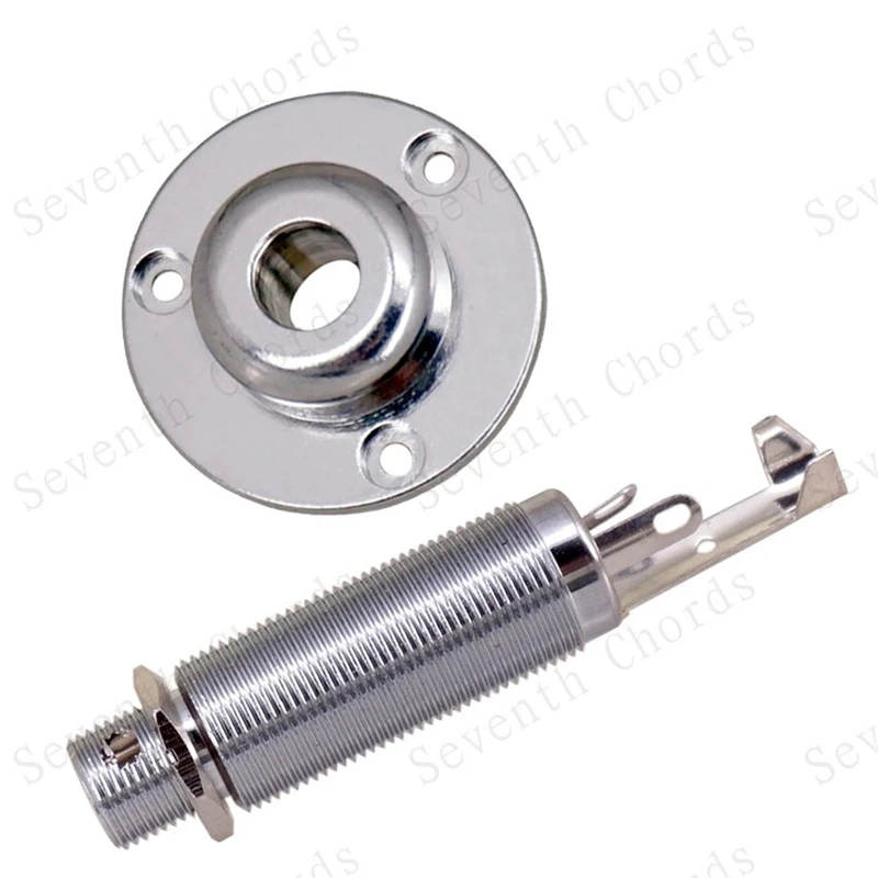 This high-quality 1/4″ (6.35mm) guitar jack socket features a durable metal construction with a sleek chrome-plated silver finish and three prongs for secure connectivity. Weighing approximately 21 grams, it is compatible with guitar strap lock pins and suitable for electric and acoustic bass guitars. Designed to meet standard specifications, this jack socket ensures reliable signal transmission and easy installation. The package includes one jack socket and three mounting screws for convenience. Its polished appearance and robust build make it an ideal choice for replacing or upgrading your guitar’s input connection, helping you achieve optimal sound quality during performances and recordings.