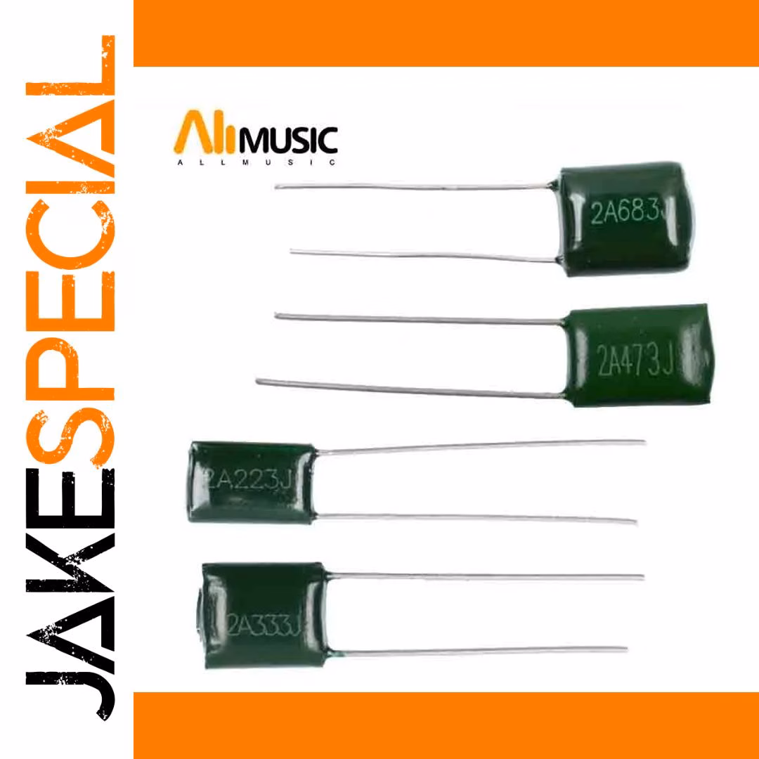- Set includes 100 polyester capacitors in four types: 2A223J, 2A333J, 2A473J, 2A683J, providing a range of tone options.