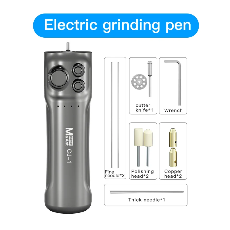 Imagine effortlessly restoring your mobile device with this sleek, silver-colored electric glue remover. Crafted for precision, its ergonomic handle ensures comfortable, steady control during delicate repairs. The device features a streamlined cylindrical body with three easily accessible control buttons— a large main button, a slightly smaller secondary button, and a tiny operational toggle—each surrounded by subtle indicator holes, hinting at intuitive operation and technical sophistication. Extending from the top is a slim metal rod designed for heating or cutting adhesive residues, ideal for removing LCD screen residue and OCA glue. Surrounding the main unit are essential accessories, including guide rods, grinding discs, and screwdrivers, all neatly arranged to facilitate professional-grade repairs and provide a complete toolkit for trusted mobile repair work. This tool combines modern design with dependable functionality, making your repair process smooth and efficient.
