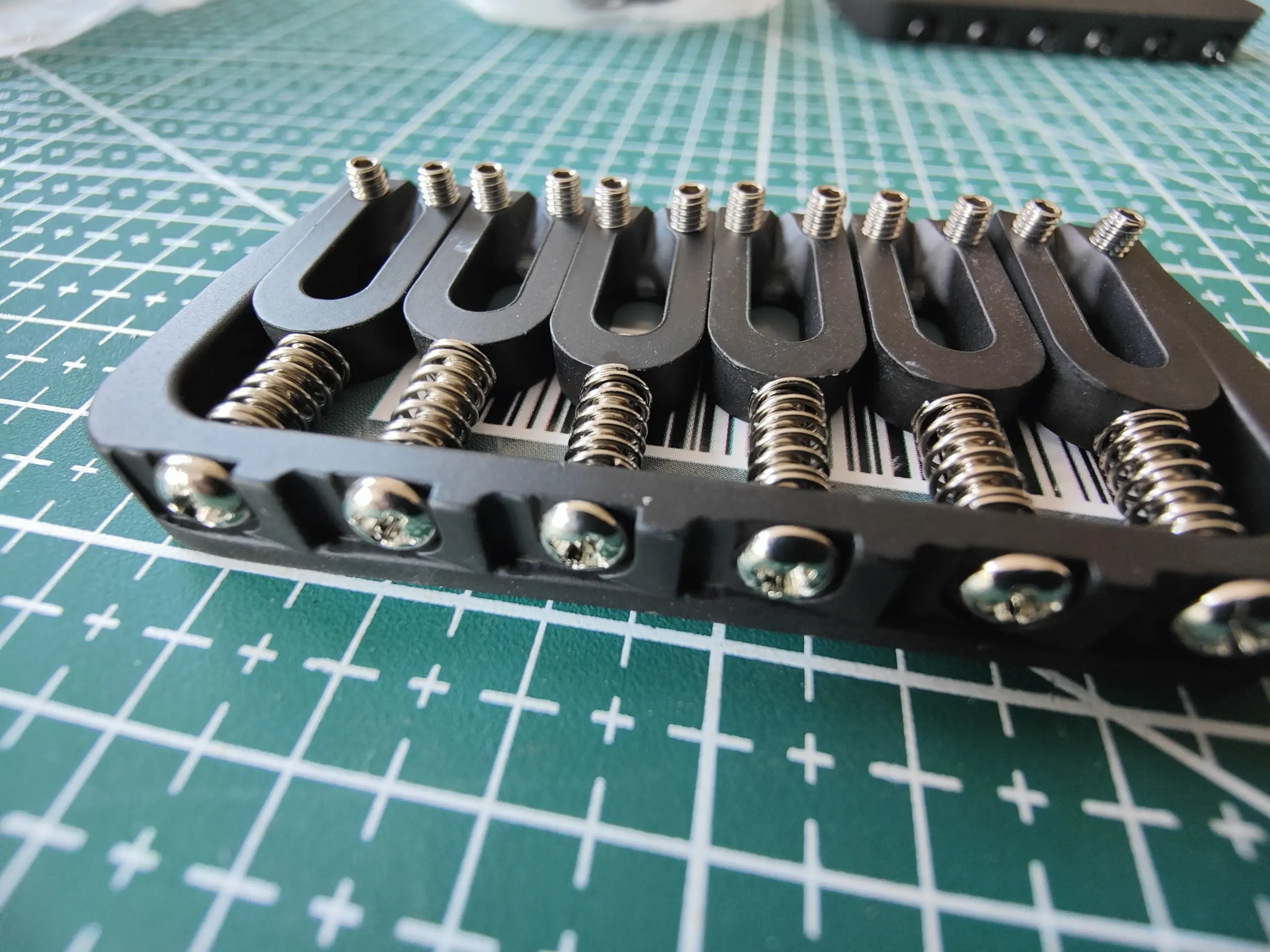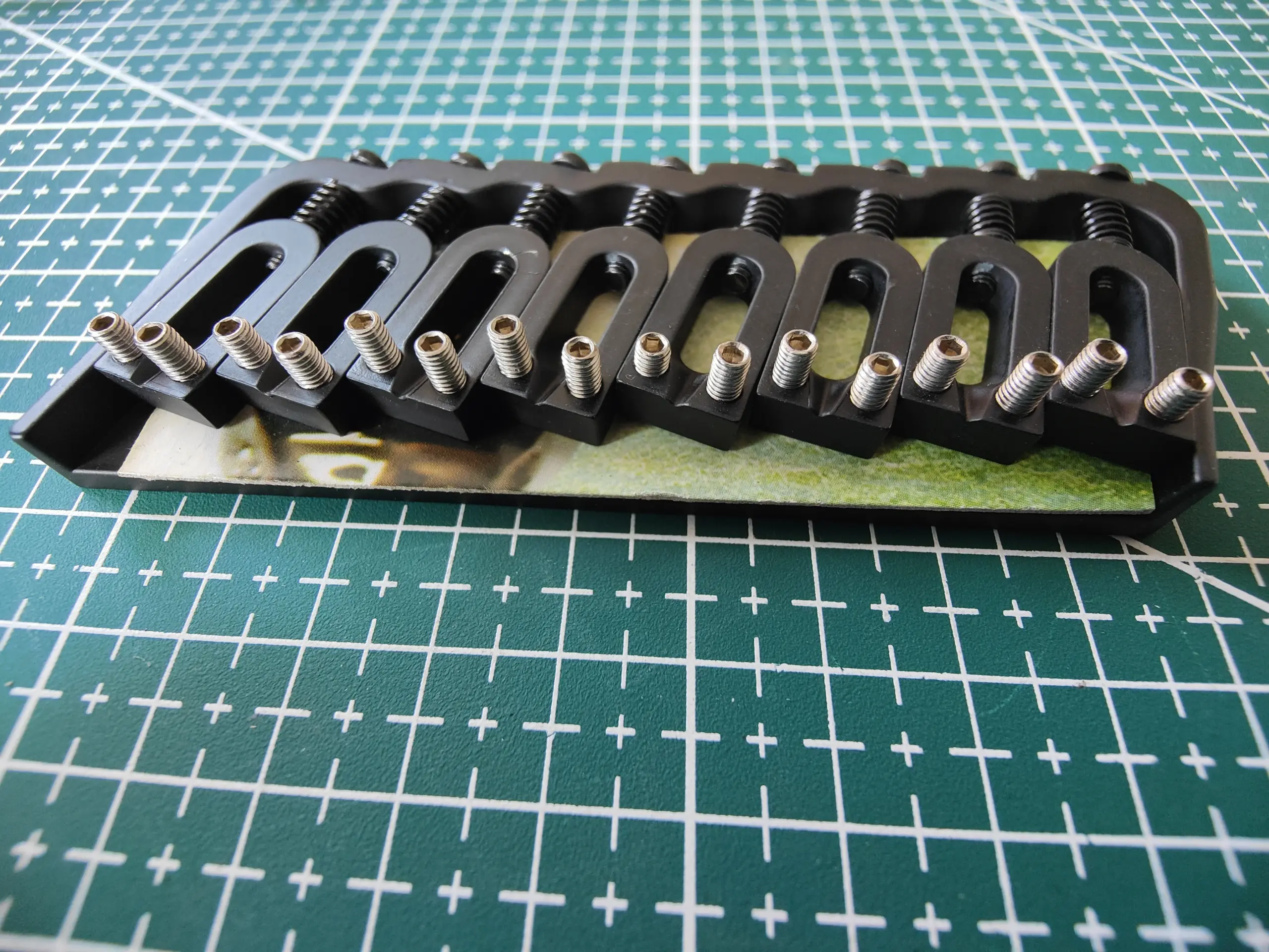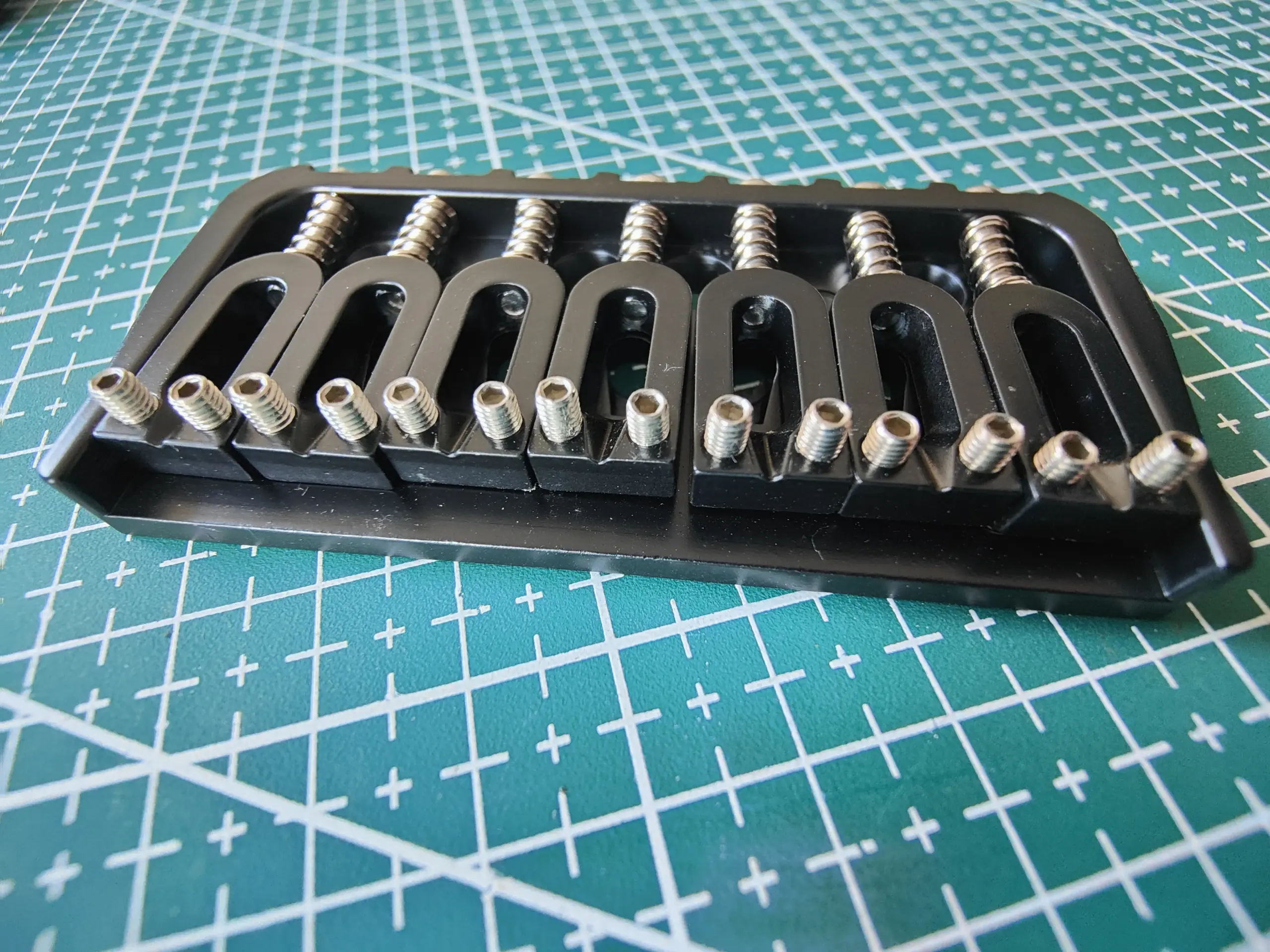 Replace your old guitar bridge with this top-quality fixed bridge designed for electric guitars. Available for 6, 7, or 8 string configurations, the sleek black finish will give your instrument a modern look. Imagine playing with enhanced tuning stability and improved string resonance, allowing you to immerse yourself in your music fully. This bridge is an essential addition to your guitar if you are looking to upgrade or repair your instrument. Feel the difference in sound quality and playability as you strum away, elevating your performance to new heights with this remarkable bridge.