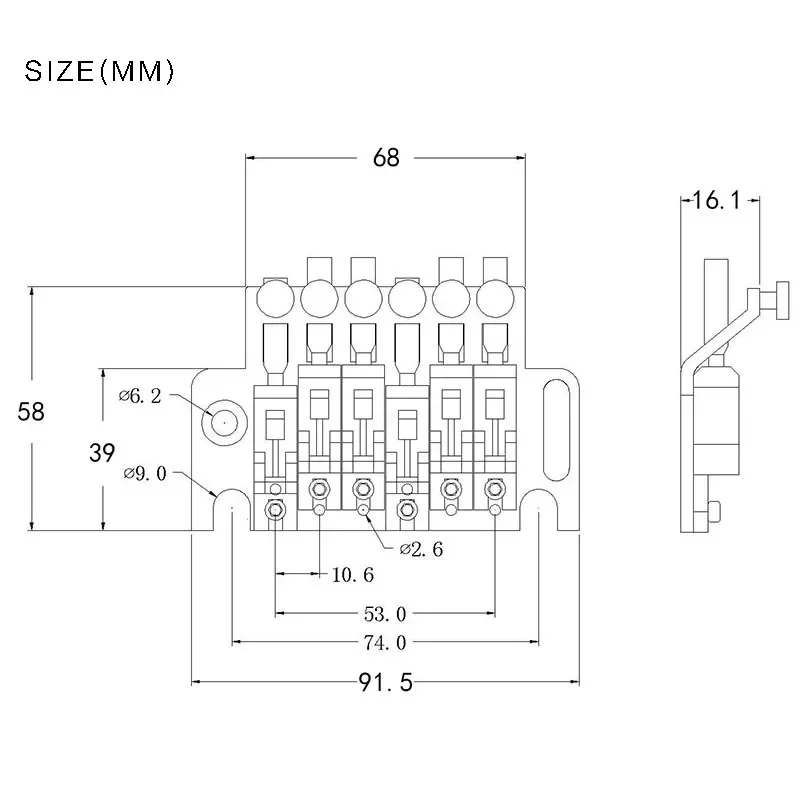 This Electric Guitar Tremolo Bridge System combines modern aesthetics with outstanding functionality, ensuring you maintain sublime tuning stability during performances. Its double locking edge design includes a sleek chrome finish complemented by matte black accents, establishing a stylish, professional appearance. Multiple adjusting screws and a tremolo bar slot facilitate your customization needs. Built from durable metal and designed for a string spacing of approximately 10.6mm, it fits seamlessly into your guitar setup. With its 74mm mounting size, you can easily elevate your playing experience—visualize yourself rocking out with precision and confidence!