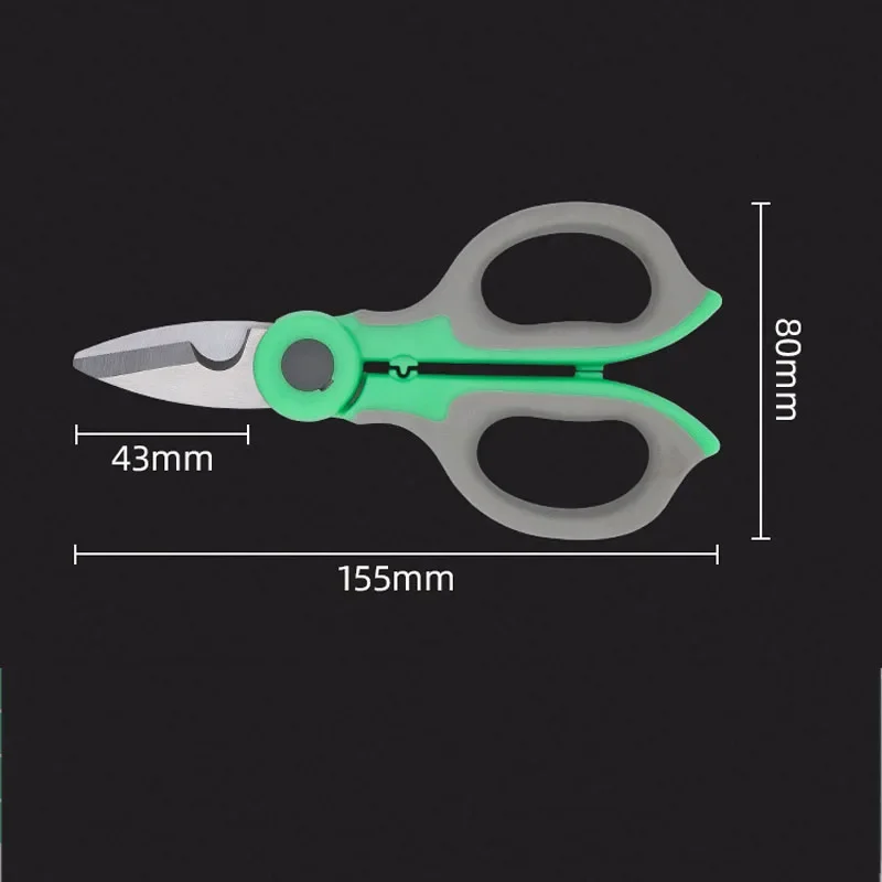 These versatile electrician scissors are the perfect addition to your toolkit. With a total length of 155mm and a lightweight design of only 98g, they are easy to handle for all your cutting tasks. The 43mm stainless steel blade stands out with its polished finish and sharp cutting edge, allowing you to cut through iron sheets, fishing lines, and electric wires with precision and ease. Ergonomically designed with a green handle accented by grayish grips, the PP and TPR combination ensures comfort and prevents slippage, making every cut intuitive and controlled. This practical tool is ideal for both household and professional use, emphasizing simplicity while delivering exceptional performance.