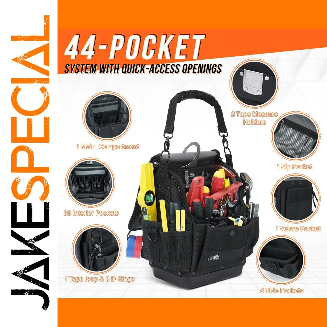 - Includes 44 pockets: one large main compartment for drills and grinders, 30 interior pockets, five external side pockets, and a zippered section for secure storage.
