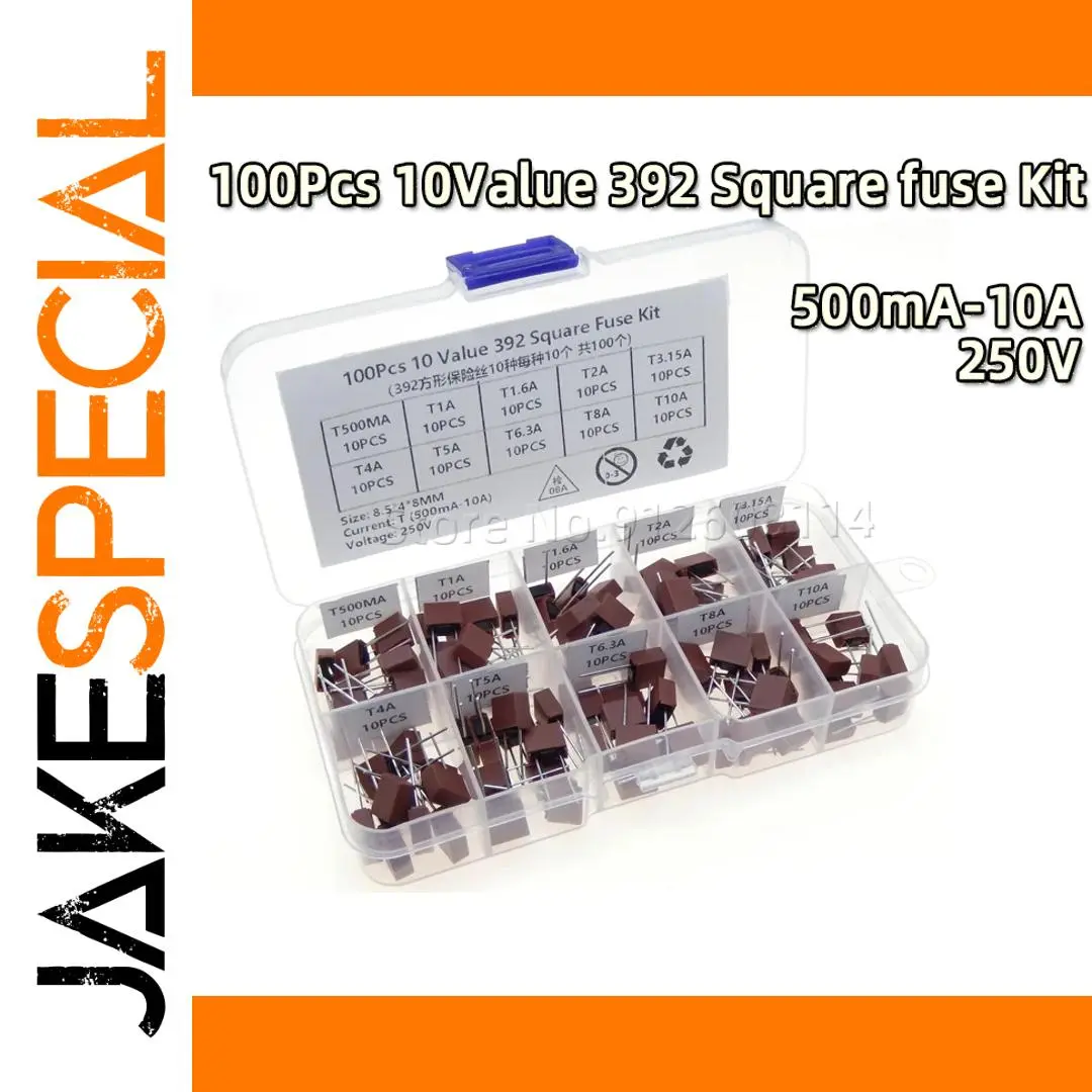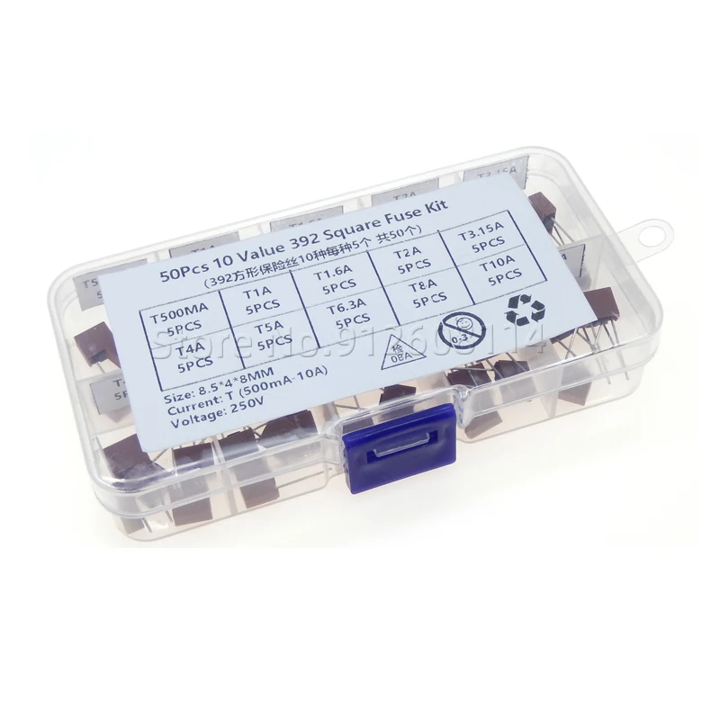 This fuse assortment kit features 50 or 100 square plastic fuses in a transparent storage box, organized by varying current ratings from 0.5mA to 10A, all rated at 250V. Designed with DIP packaging standards, these compact 392-size fuses are ideal for LCD TV power boards and computer applications, providing reliable electronic protection. The fuses are new, chemical-free, and neatly arranged in either sets of five or ten pieces per value for easy identification and quick replacement. Perfect for electronics enthusiasts and professionals, this organized kit ensures you have the right fuse at hand for maintaining device safety and functionality.