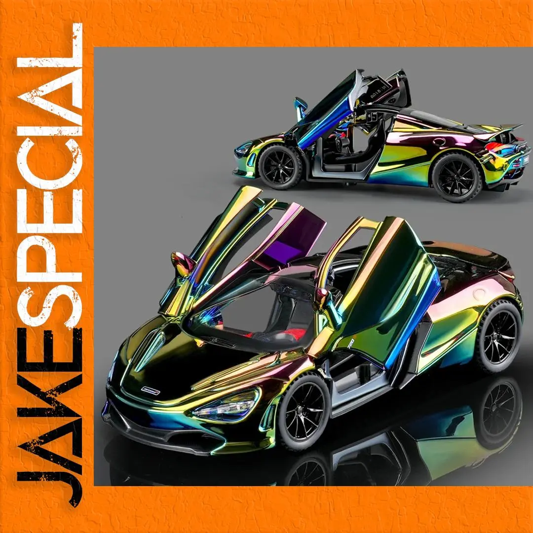 Experience the exhilarating design of the Electroplate Version 1:24 McLaren 720S Alloy Sports Car Model, a remarkable diecast representation of this iconic sports car. Finished in a striking electroplated style, the model gleams with a vibrant, multi-colored sheen that captivates from every angle. Its incredibly detailed body, primarily black with iridescent accents, transitions through shades of purple, gold, green, and blue, enhancing its allure. With precision-cut gullwing doors that open to reveal a finely crafted interior, accompanied by sound and light effects, this model is perfect for both collectors and enthusiasts who enjoy interactive elements. Get ready to embrace a new level of automotive art in your collection.
