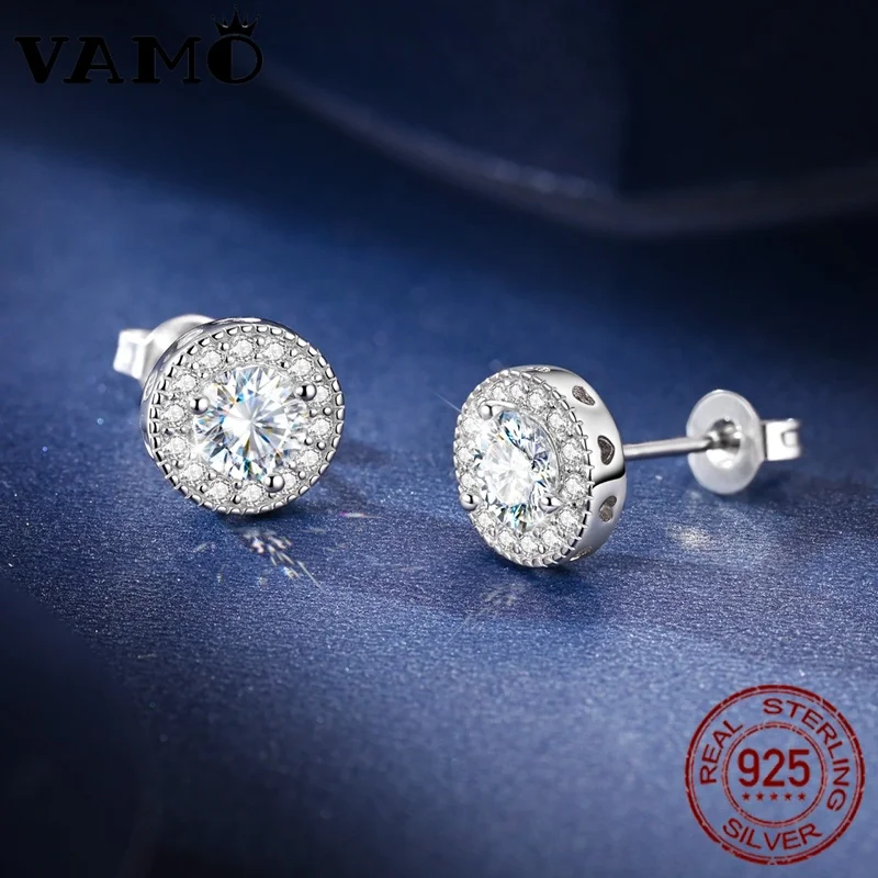 Imagine yourself wearing these stunning VAMO Classic Moissanite Earrings, adding a touch of sophistication to your wardrobe. Crafted from high-quality 925 sterling silver, these earrings feature a polished, luminous finish that catches the light beautifully. The centerpiece is a large, round-cut moissanite stone, mimicking the brilliance of a diamond, with a remarkable 0.5 carats per stone. Encircled by a delicate halo of smaller pave-set stones, each pair radiates a luxurious sparkle suitable for weddings or formal events. Designed with timeless style in mind, these earrings comfortably sit on the earlobes with a secure post and butterfly clasp, making them perfect for special occasions or everyday elegance. Experience true craftsmanship and understated glamour with every wear.