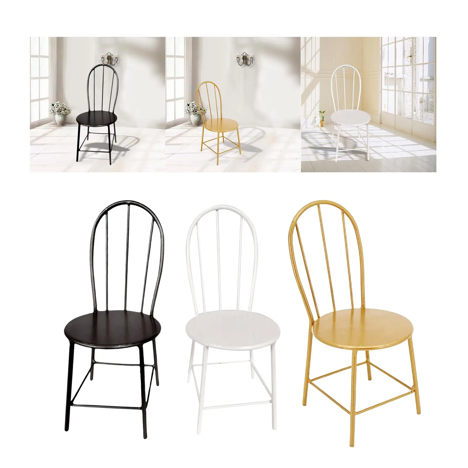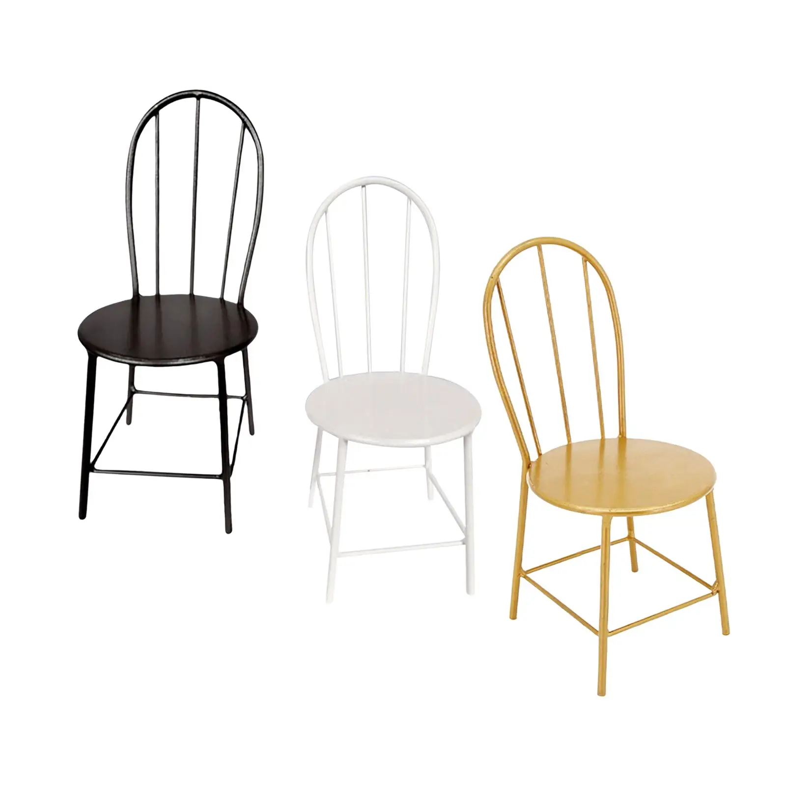 Imagine adding a touch of sophistication to your miniature scene with this beautifully crafted 1/6 scale metal dining chair. Its timeless design features a curved backrest with vertical metal rods, a smooth, comfortable seat, and slender, tapered legs reinforced for stability—all finished with a polished, glossy surface. Available in aureate, black, and white, each chair brings a unique style that complements various miniature decor styles. Carefully crafted from high-quality iron, these miniature chairs are lightweight yet durable, making them perfect for dollhouse decoration, role-playing, or as a collectible gift. Size and detail combine to make this accessory a charming addition to your miniature world, emphasizing both elegance and craftsmanship.